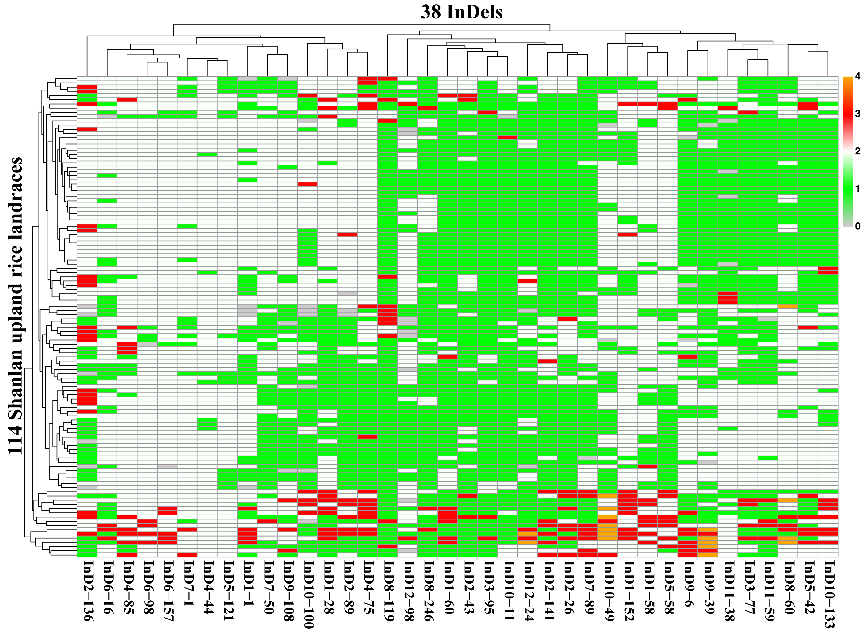 Figure 5. Heatmap illustrating the genotypic variation of 114 Shanlan upland rice landraces across 38 markers. Each row corresponds to a rice variety, and each column corresponds to an InDel marker. The colors indicate the presence of grey, red, white, green and orange representing specific alleles at each marker site of 0, 1, 2, 3, and 4. The hierarchical clustering on both axes shows the genetic relationships between varieties and markers.