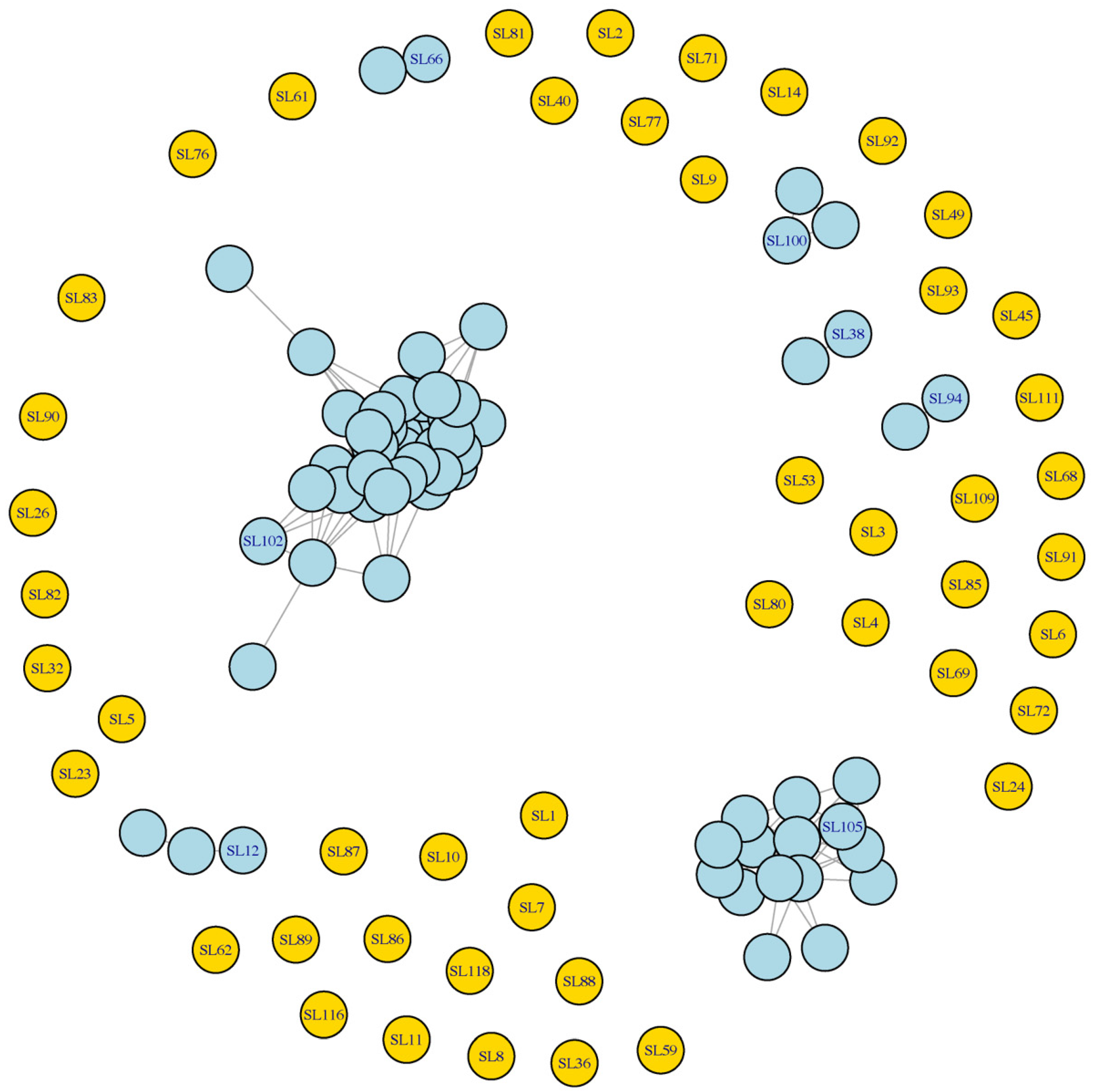 Figure 6. Network visualization of genetic similarity among Shanlan upland rice landraces. Nodes represent landraces, and edges connect pairs with SMC ≥ 0.85. Colors distinguish different connected components, representing distinct genetic groups formed under this similarity threshold. Core accessions selected from each group are labeled.