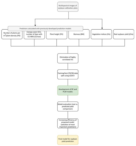 The main goal of this research was to develop an ML model for in-season prediction of soybean yield using temporal UAV data. The study was based on a comprehensive approach that included the use of two ML algorithms (RF and PLSR) and a complex predictor dataset consisting of VIs, PD, CC, PH, and BM assessed at several time points during the growing season. All input variables were obtained through HTPP using previously described methods and utilized as direct predictors within the ML models. Therefore, the specific aim of the present study was to provide a fully digital framework for accurate and reliable estimation of yield as the most important crop trait.