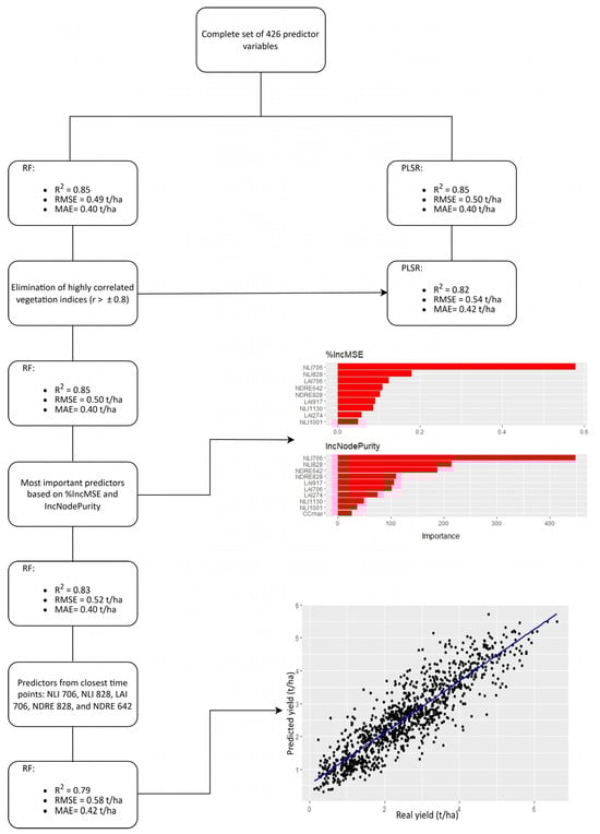 Since the PLSR model was outperformed and subsequently eliminated, the following steps focused on further improving the efficiency of the proposed RF model. The variable importance for the remaining 78 predictors was observed based on two indicators, %IncMSE and IncNodePurity (p < 0.01). It turned out that CCmax and nine VIs, including LAI 274, LAI 390, LAI 706, LAI 917, NLI 706, NLI 828, NLI 1130, NDRE 642, and NDRE 828, were important. A unique set of ten selected variables and the proposed RF model with mtry = 2 and ntree = 500 set as optimal tuning parameters ensured high accuracy in soybean yield prediction (R2 = 0.85). Since the significant reduction in the number of variables (426 → 78 → 10) did not affect the precision, a last stage was initiated to create the most efficient model. This involved selection of only five predictors from three closest time points: NLI 706, NLI 828, LAI 706, NDRE 828, and NDRE 642. The final RF prediction model (mtry = 3 and ntree = 500) secured good results in soybean yield prediction, with RMSE maintained below 0.6 t/ha. The stepwise development of the final soybean yield prediction model is shown in Figure 3.