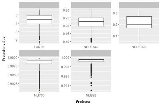 Variability of five selected predictors was analyzed through individual values obtained from the soybean calibration plots (Figure 4).
