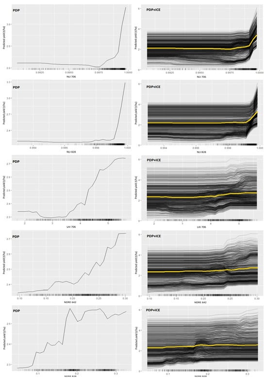 The LAI 706 values were between 1.75 and 5.63, with an average of 4.32. A wide range was observed also for the NDRE 642 and NDRE 828. For the first one, the span was between 0.1 and 0.3, while for the second, the interval was from 0.05 to 0.33. The average value of both VIs was similar (around 0.22), even with the 200 GDDs of time difference between them. Regarding NLI 706 and NLI 828, variation in individual values was small since the difference was observed only at the third or fourth decimal. In all calibration plots, NLI 706 and NLI 828 were over 0.99. The yield dynamic was observed through changes in predictor variables and shown in PDPs and PDP + ICE plots (Figure 5).