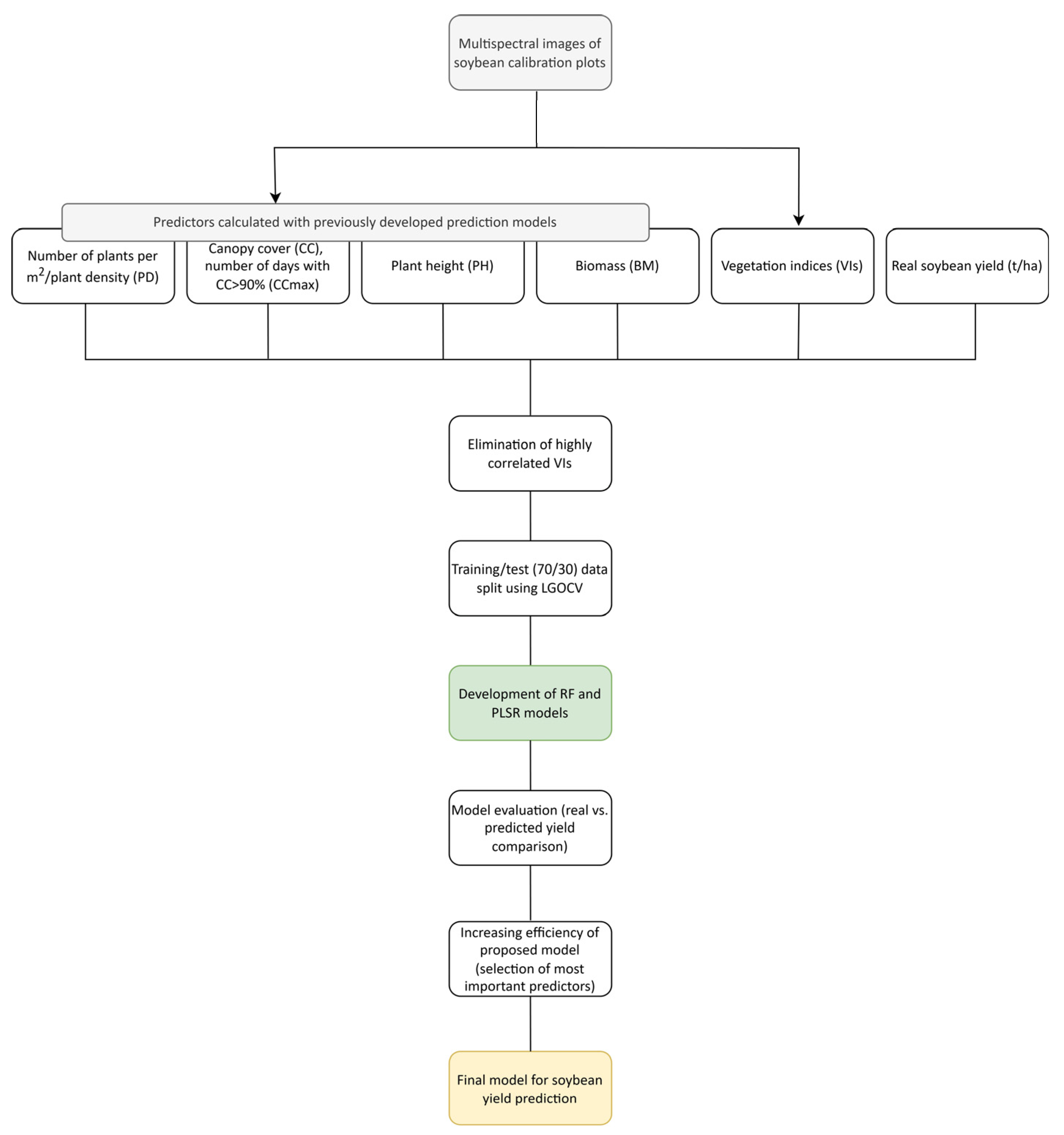 - Ranđelović, P.; Đordević, V.; Miladinović, J.; Prodanović, S.; Ćeran, M.; Vollmann, J. High-throughput phenotyping for non-destructive estimation of soybean fresh biomass using a machine learning model and temporal UAV data. Plant Methods 2023, 19, 89. [Google Scholar] [CrossRef]