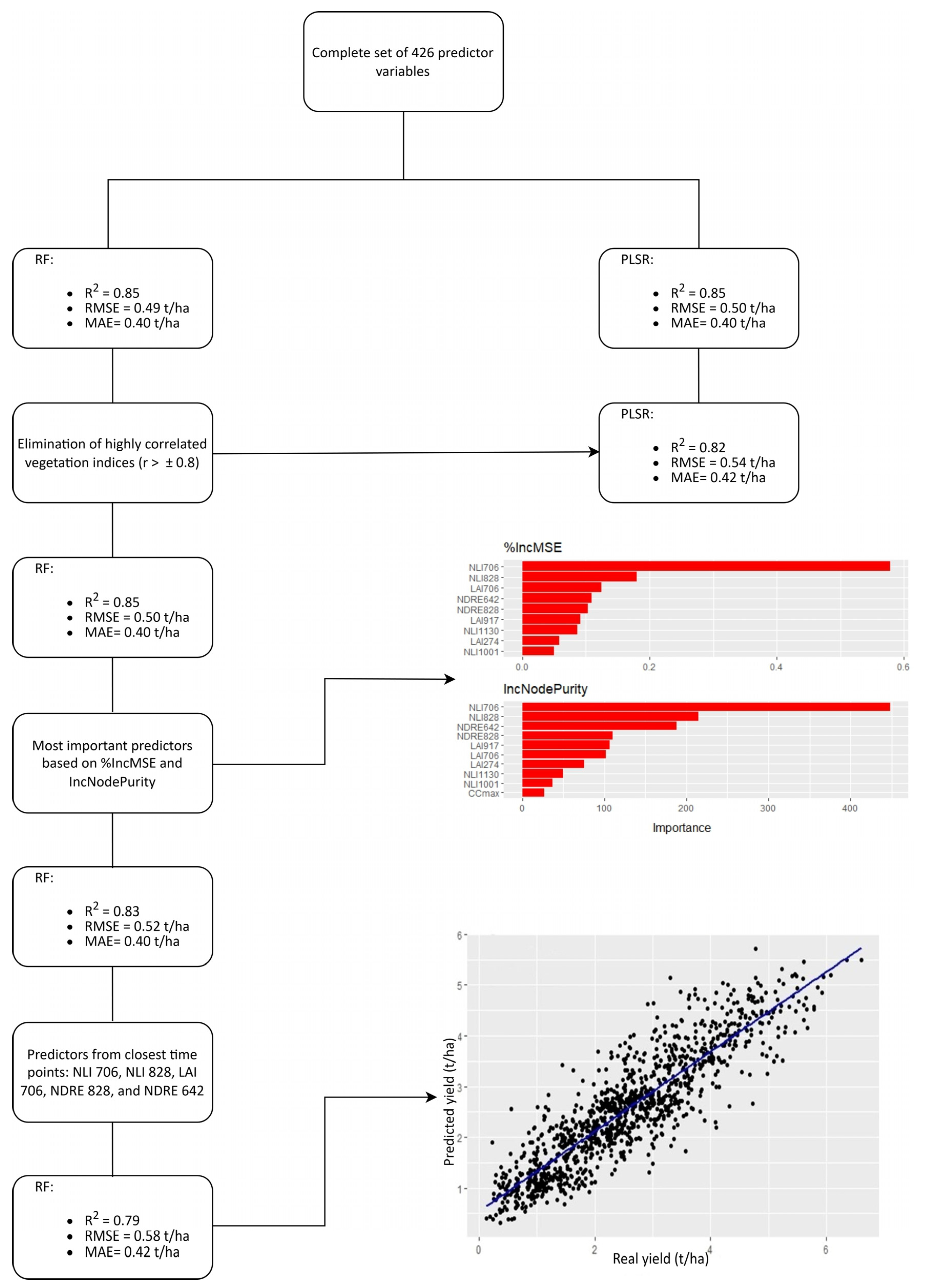 | PLSR | PD, Vis, and CC from 12 time points; CCmax; PH and BM from 8 time points | 0.85 | 0.50 | 0.47–0.52 | 0.40 |