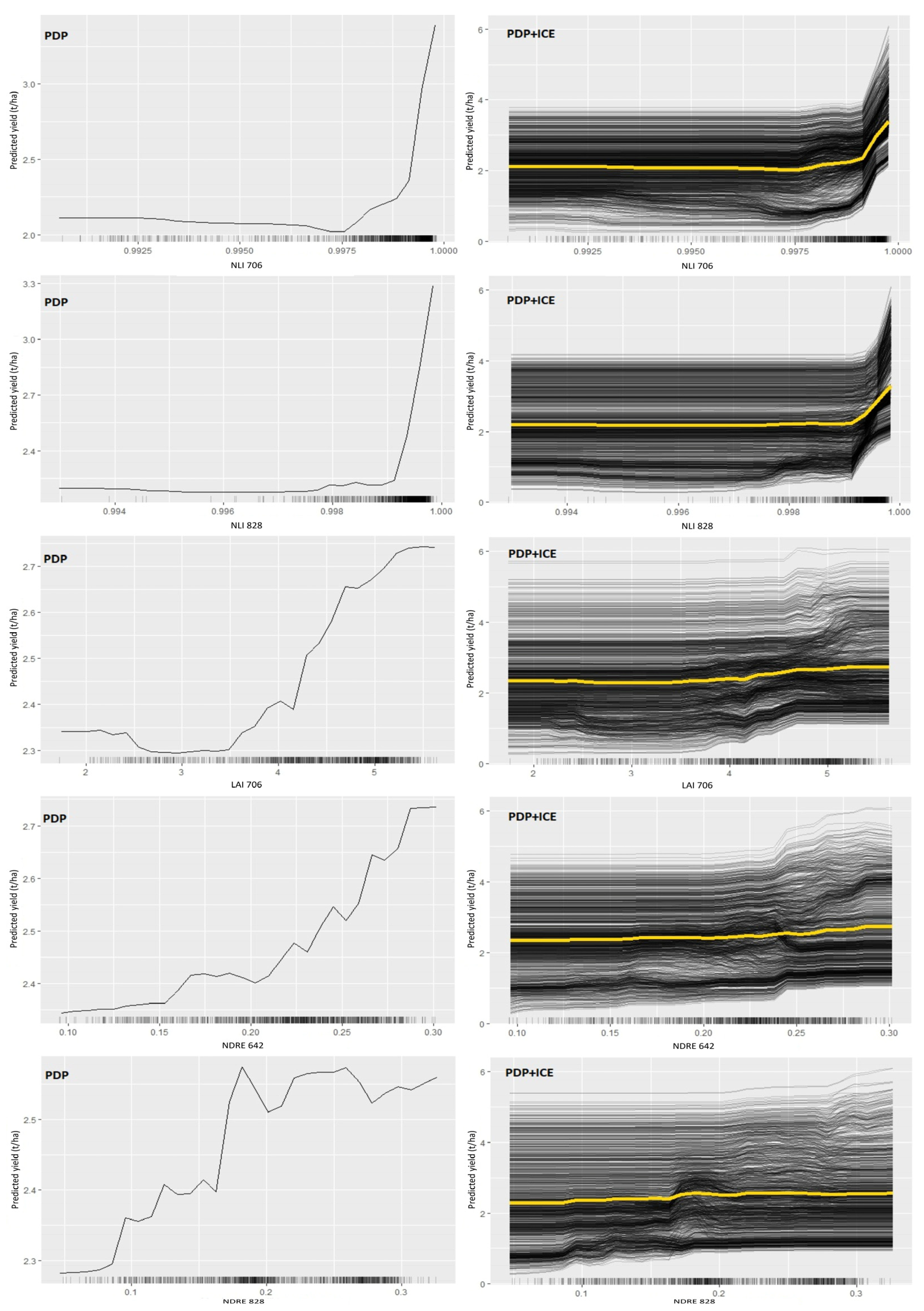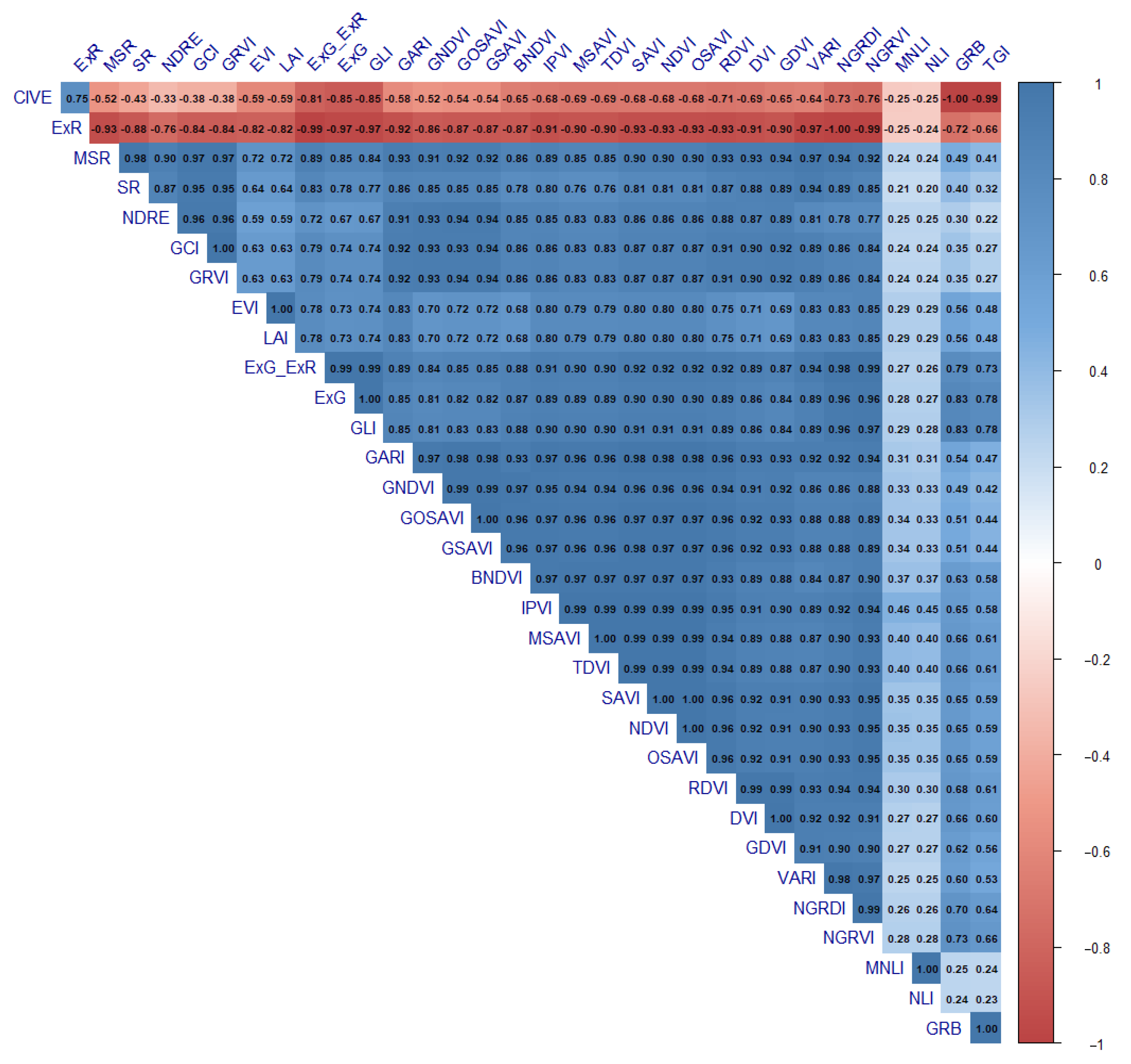 | RF | PD, LAI, NLI, NDRE, TGI, and CC from 12 time points; CCmax; PH and BM from 8 time points | 0.85 | 0.50 | 0.47–0.53 | 0.38 |