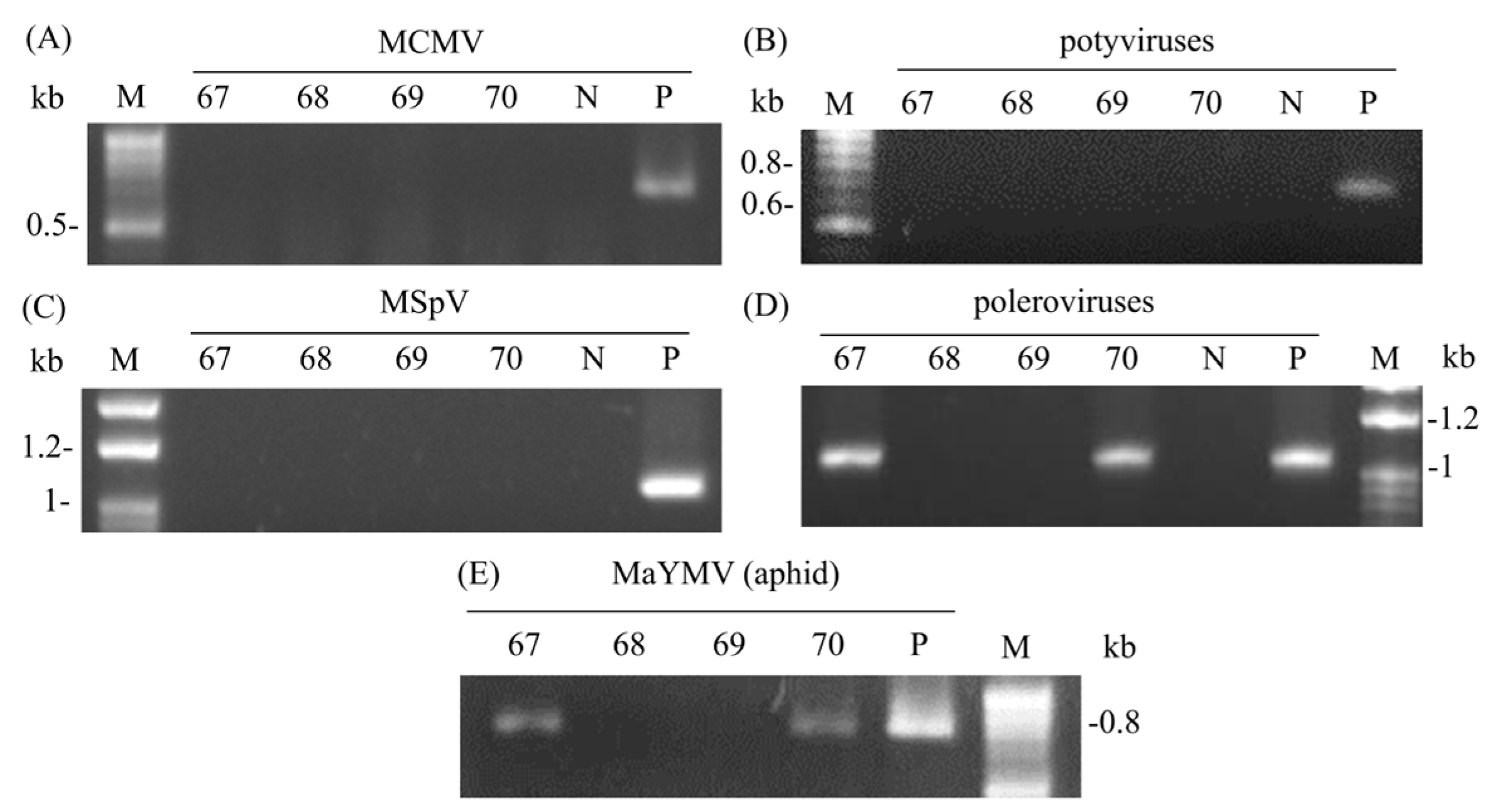 Figure 1. The detection results for four maize plants collected in November 2022. The samples, numbered 67–70 representing 111-ma-67~111-ma-70, were detected for various viruses. (A) Specific primers for maize chlorotic mottle virus (MCMV) with an expected band size of 517 bp. (B) Degenerate primers for potyviruses with an expected band size of 600–750 bp. Positive control: Bidens mottle virus (BiMoV). (C) Specific primers for maize stripe virus (MSpV) with an expected band size of 1100 bp. (D) Degenerate primers for poleroviruses with an expected band size of 1096 bp were used for maize plant virus detection. Positive control: maize yellow mosaic virus (MaYMV). (E) Specific primers for MaYMV with an expected band size of 798 bp were used for virus detection with the aphid that infested the maize plant.