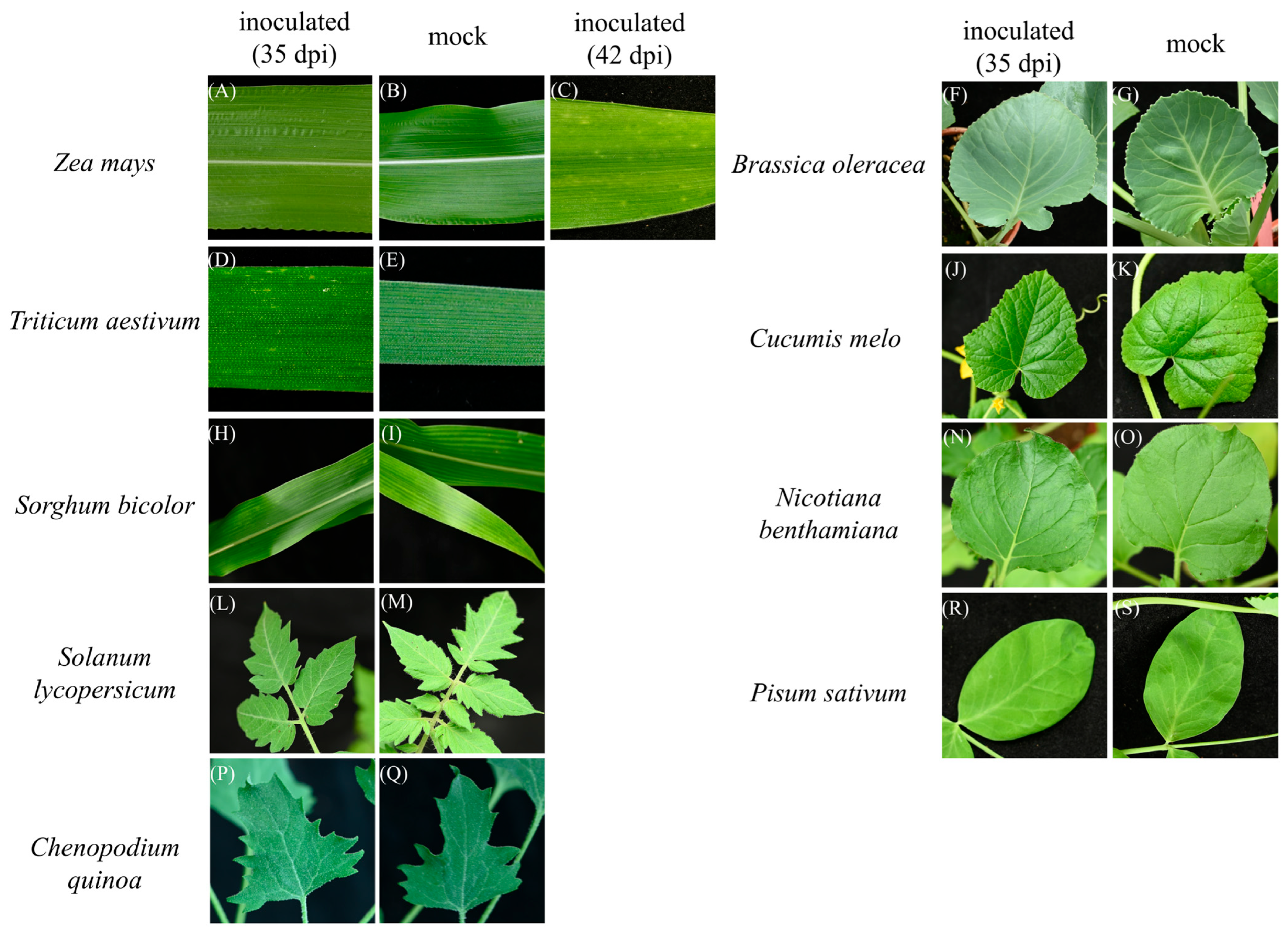 Figure 2. Inoculation results of host range test. Both wheat and corn were successfully inoculated with maize yellow mosaic virus (MaYMV), displaying mosaic symptoms. (A) Maize plant 35 dpi. (B) Control maize plant. (C) Maize plant 42 dpi. (D) Inoculated wheat plant. (E) Control wheat plant. (F) Inoculated cabbage plant. (G) Control cabbage plant. (H) Inoculated sorghum plant. (I) Control sorghum plant. (J) Inoculated muskmelon plant. (K) Control muskmelon plant. (L) Inoculated tomato plant. (M) Control tomato plant. (N) Inoculated Nicotiana benthamiana plant. (O) Control Nicotiana benthamiana plant. (P) Inoculated quinoa plant after inoculation. (Q) Control quinoa plant. (R) Inoculated pea plant. (S) Control pea plant. Pictures were taken at 35 dpi, except for maize, which was taken at 42 dpi when symptoms appeared.
