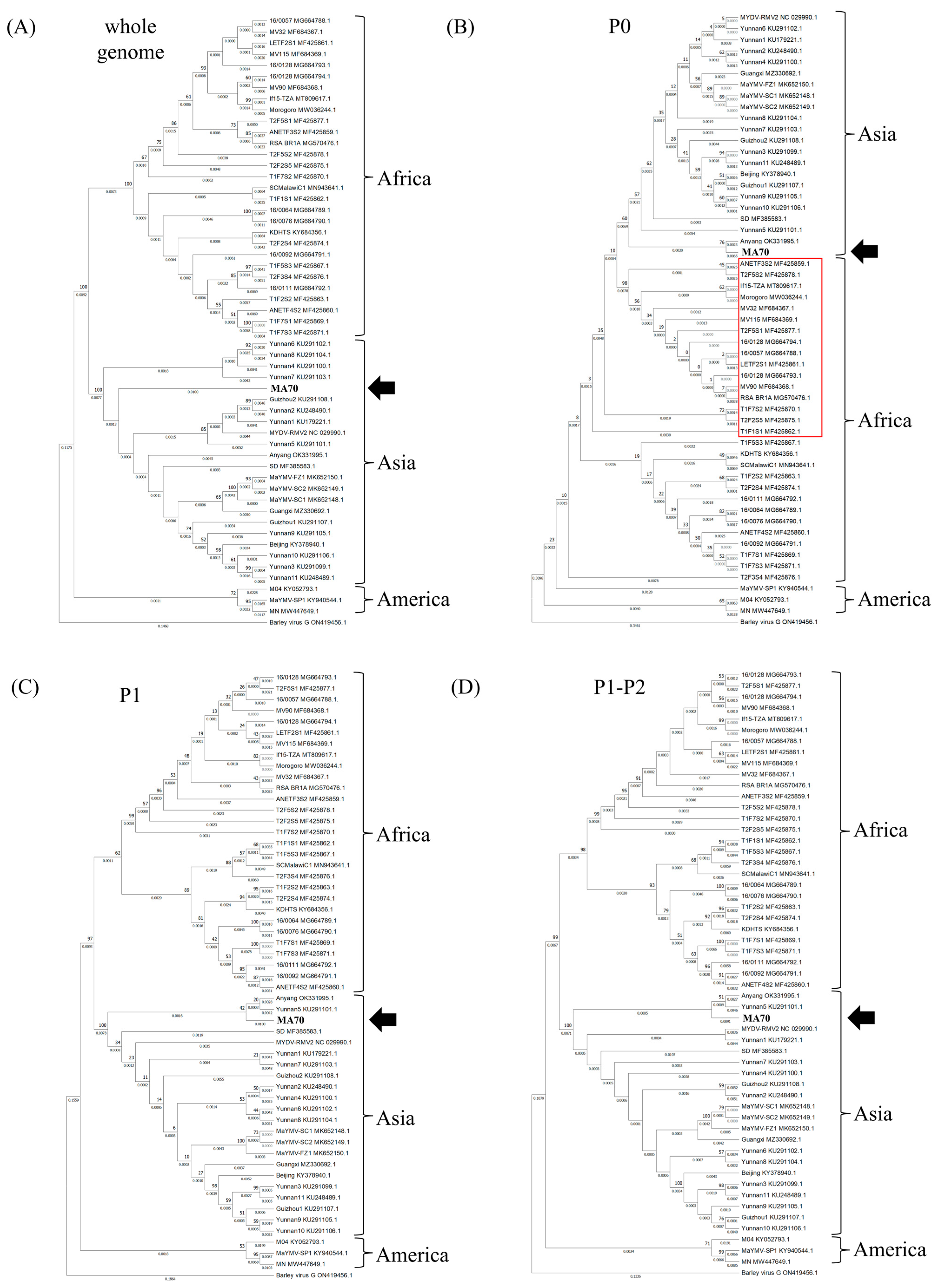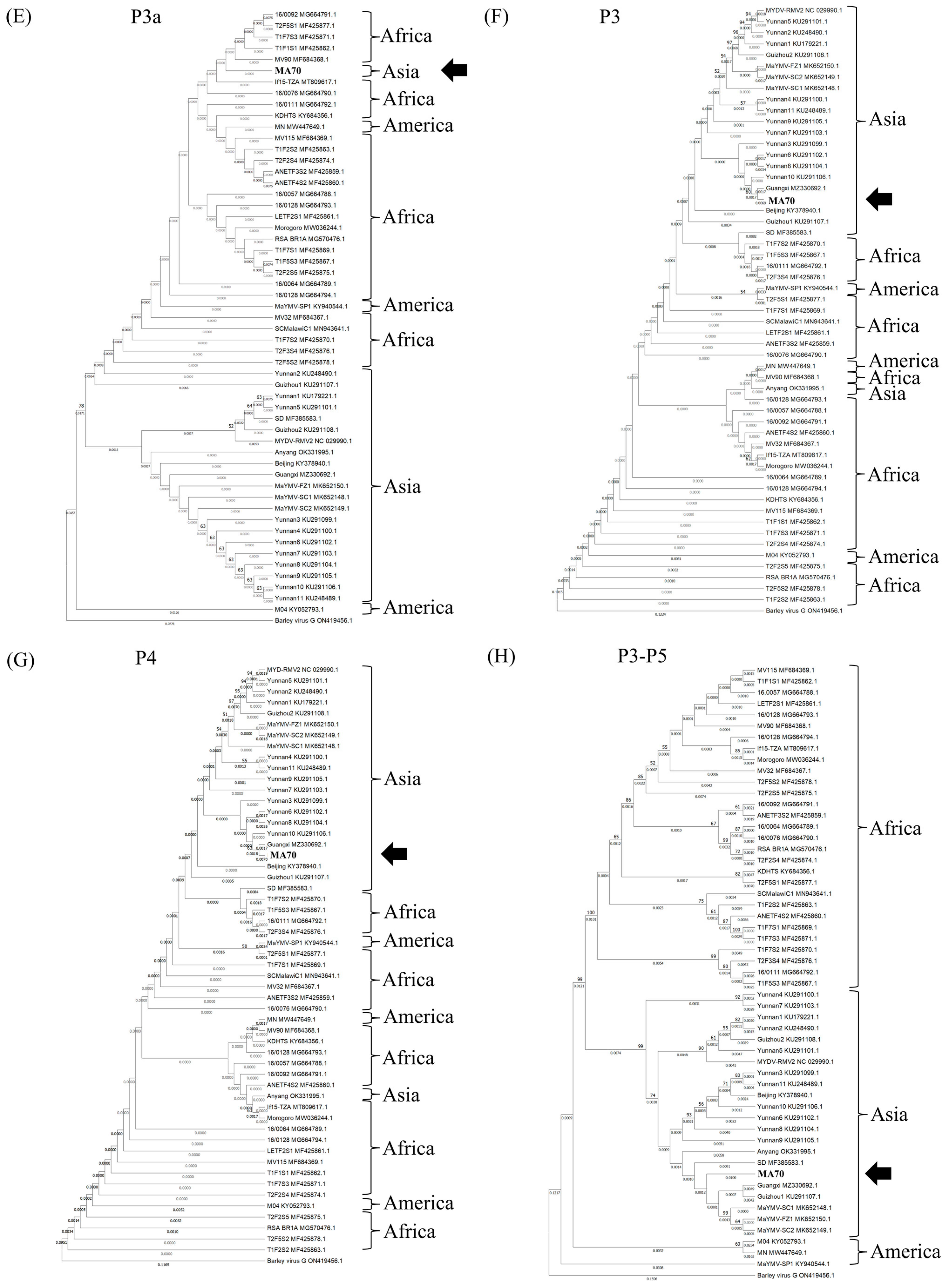 Figure 3. Phylogenetic trees based on the whole genome and individual gene nucleotide sequences. The trees were constructed using the neighbor-joining (NJ) method with 55 MaYMV isolates (including MA70, highlighted in bold and indicated with an arrow) and one BVG isolate on GenBank. The evolutionary distances for each branch were calculated using 1000 bootstrap replicates. Species names on each branch are composed of the name and accession number of virus isolates. Barley virus G (BVG) was used as the outgroup. (A) The whole genome phylogenetic tree can be divided into three groups: African, Asian, and American. (B) The phylogenetic tree based on the P0 gene can be divided into four groups, where 15 African isolates (isolates within the red box) cluster with Asian isolates, the remaining 14 African isolates form another group, the American isolate MaYMV-SP1 forms its own group, and two other American isolates form another group. The phylogenetic trees based on (C) P1 and (D) P1-P2 genes show similar grouping patterns to the whole genome phylogenetic tree. Phylogenetic trees based on (E) P3a, (F) P3, and (G) P4 gene do not show geographic clustering. (H) The phylogenetic tree based on the P3–P5 gene can be divided into four groups: two groups are from Asia and Africa, the American isolate MaYMV-SP1 forms its own group, and two other American isolates form another group. In phylogenetic trees where geographical clustering is observed, MA70 is most closely related to other Chinese isolates.