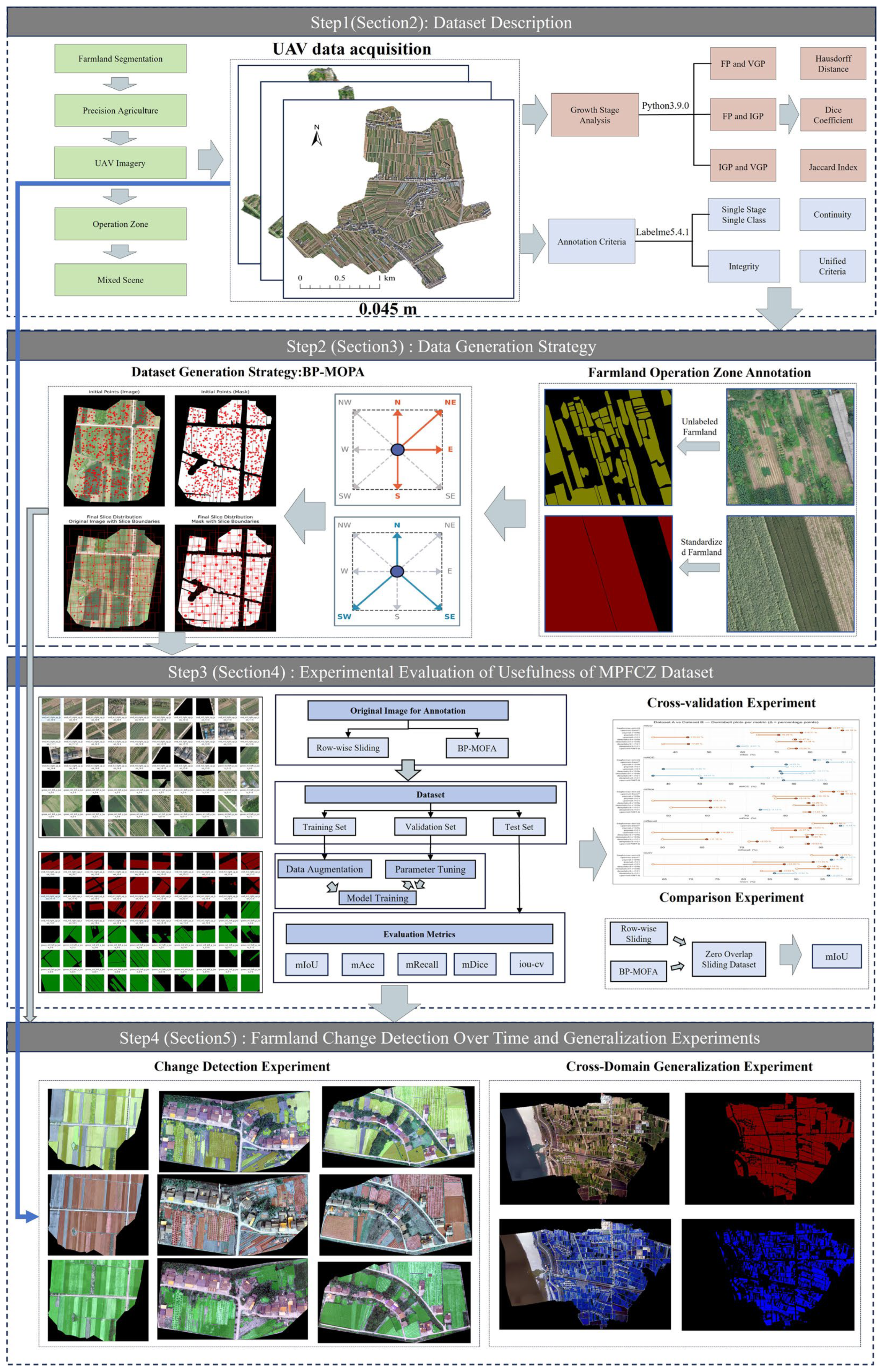 Figure 1 illustrates the research framework of this study. The workflow begins with the acquisition and preprocessing of multi-temporal UAV imagery across three distinct phenological stages. Subsequently, instance-level annotation and rigorous quality control are performed to generate precise semantic masks. The core innovation follows, where the proposed BP-MOPS strategy is applied to generate a balanced and boundary-enhanced tile dataset from the annotated orthomosaics. The constructed MPFCZ dataset then undergoes a two-phase experimental evaluation, each with a distinct focus: the first phase employs the dataset to train various deep learning models to verify its usefulness, and the second phase assesses the utility of the dataset on farmland change detection over time and its generalization for a new imagery.