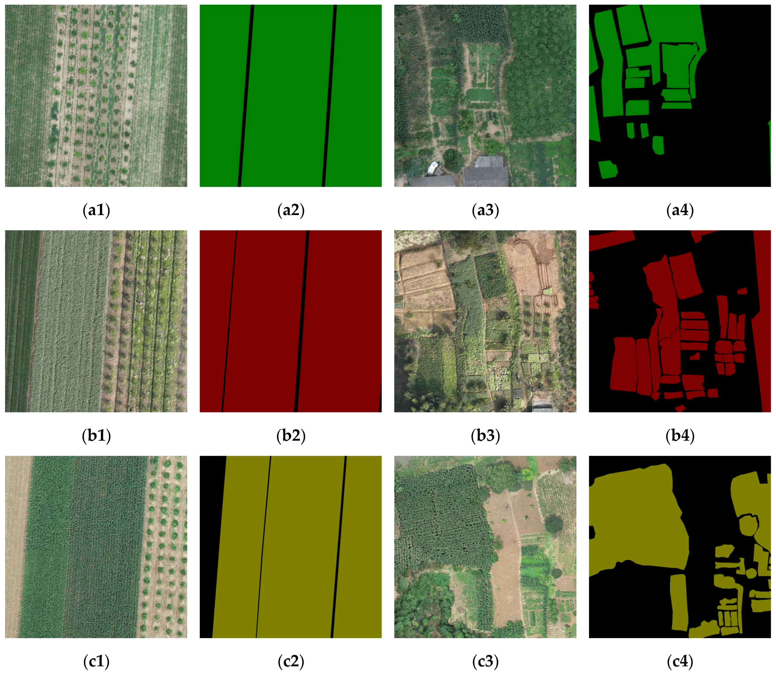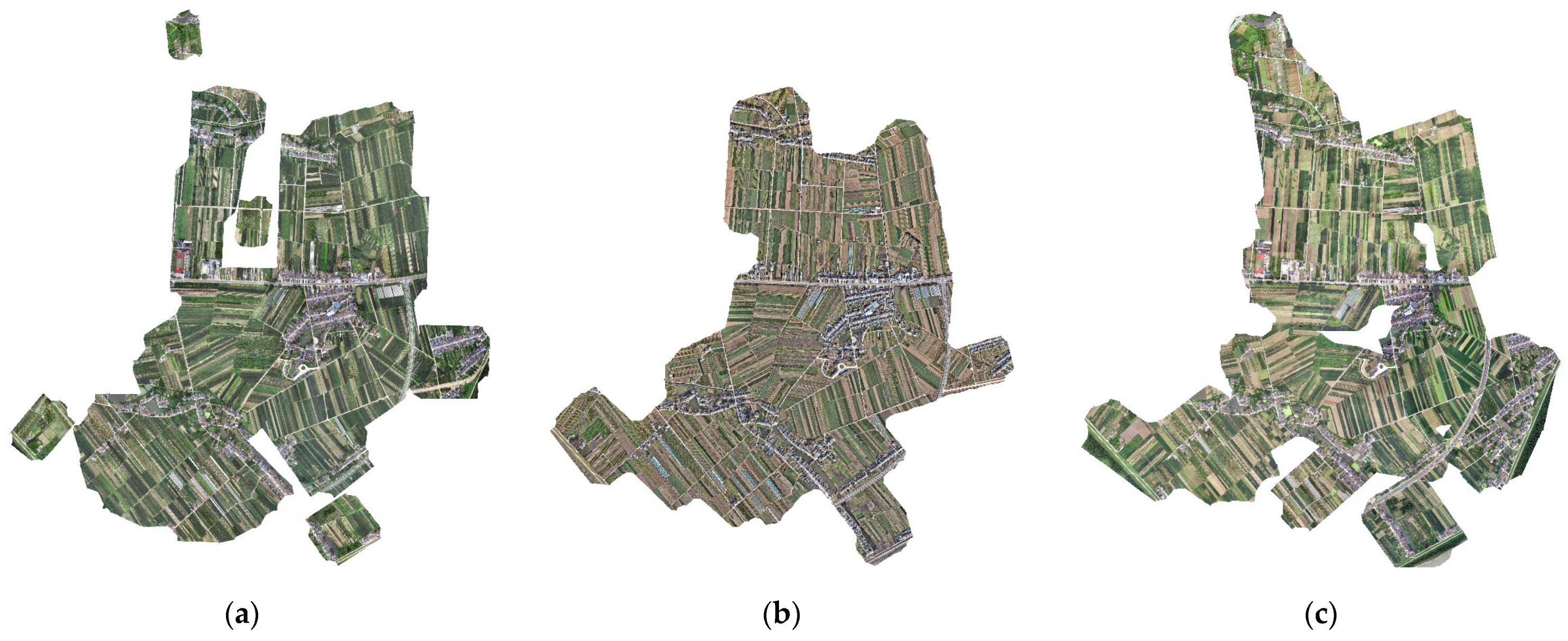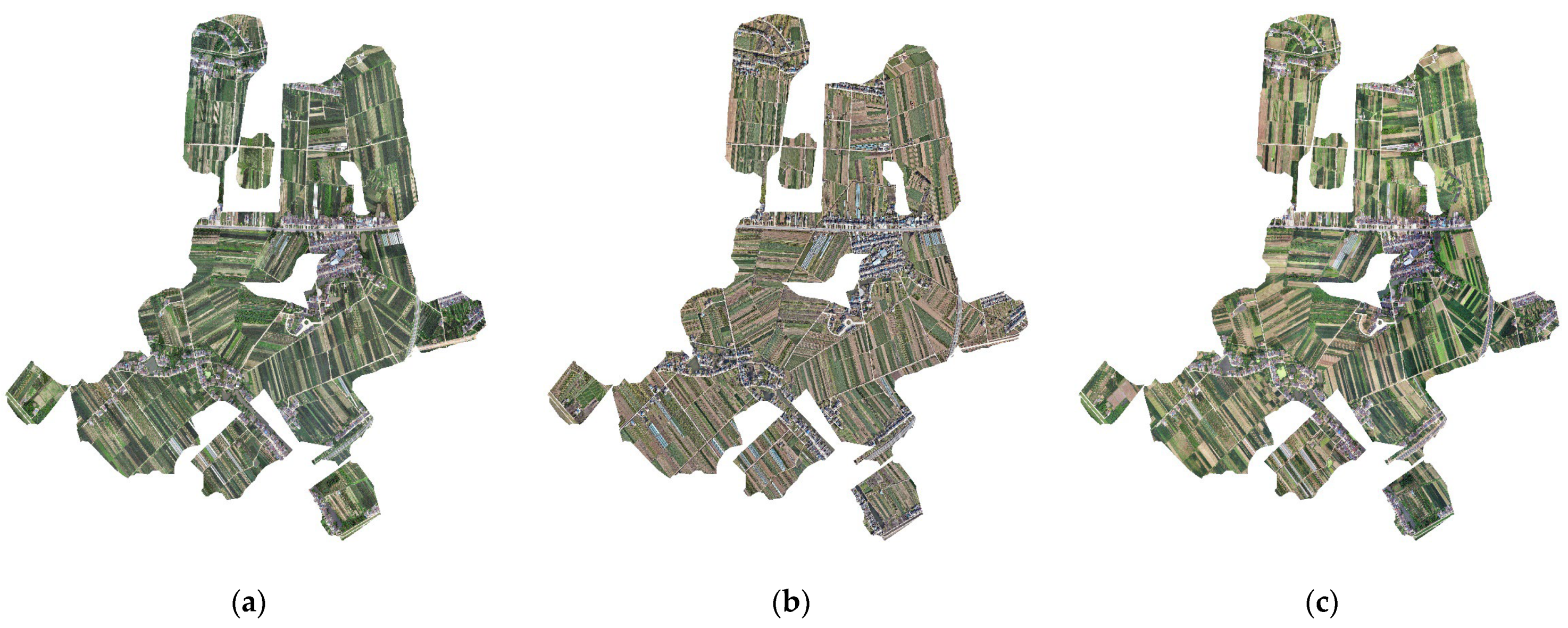 Section 4.2) and tested it directly on a new dataset which was collected from the Yanzha Village area in Jiangling County, Hubei Province. The agricultural characteristics of Yanzha Village differ significantly from those of the training data source (Zhouhu Village in Zhijiang City). Specifically, Zhouhu Village comprises a mixed system of high-standard farmland and fragmented small plots, dominated by large-scale cultivation of staple crops like rice and rapeseed. In contrast, Yanzha Village features a relatively homogeneous farmland structure, focusing on the intensive management of economic crops such as sugarcane and vegetables. The test data, covering an area of approximately 659 hectares in Yanzha Village, was resampled to a spatial resolution of 0.045 m, resulting in a total of 1995 image slices, each with dimensions of 1024 × 1024 pixels.