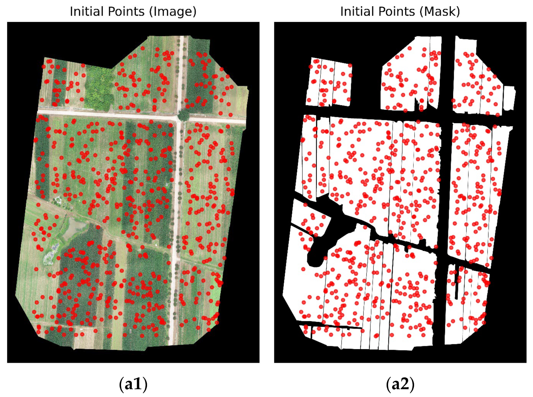 Figure 8(a1,a2) illustrate the point selection process using minimum-overlap Poisson-disk sampling (MOPS), ensuring that the spatial overlap between any two tiles is minimized. The overlap rate is used to estimate the number of pre-selected tiles, which results in a uniformly distributed set of sample points with maximum inter-point distance. This sampling strategy reduces overlap in square tiles while maximizing spatial coverage.