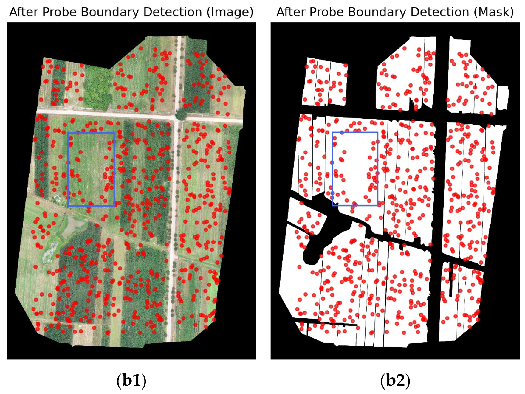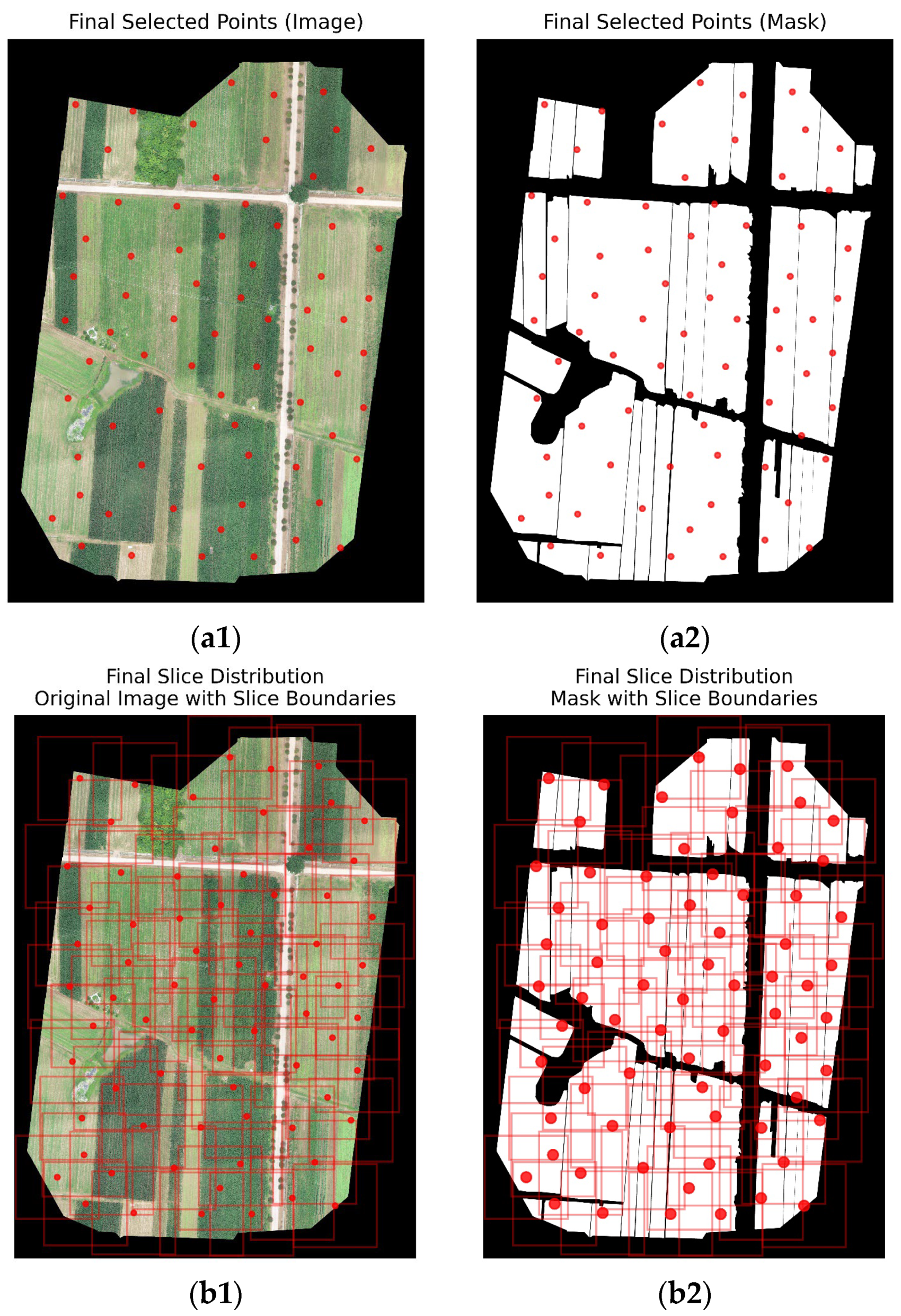 Figure 8(b1,b2) show the process of using BP-MOPS-filtered sample points as tile center points, cropping image tiles of a preset size, and constructing a standardized UAV imagery dataset. The BP-MOPS strategy ensures that each tile in this dataset maximally captures farmland boundary information.