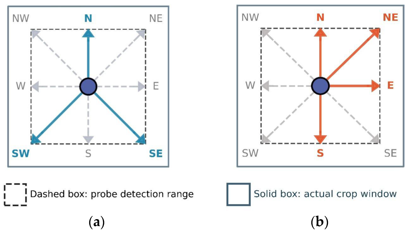 47] and enhances boundary information through direct mask analysis. This approach operates directly on the original image and its corresponding mask, requiring no model training or iterative learning. The BP-MOPS method is guided by the principle of leveraging annotated masks to enable boundary-aware tile selection. The process consists of two stages: the first is boundary-aware sampling, and the second is spatially uniform sampling. In the first stage, those boundary key points are detected through probe-based analysis of the mask pattern, directly identifying geometrically significant locations from the mask data. This effectively increases the coverage density of boundary areas and fragmented cultivation zones. In the second stage, the MOPS method is applied to select a spatially uniform subset from the boundary points, thereby achieving low inter-tile overlap and maintaining spatial representativeness.