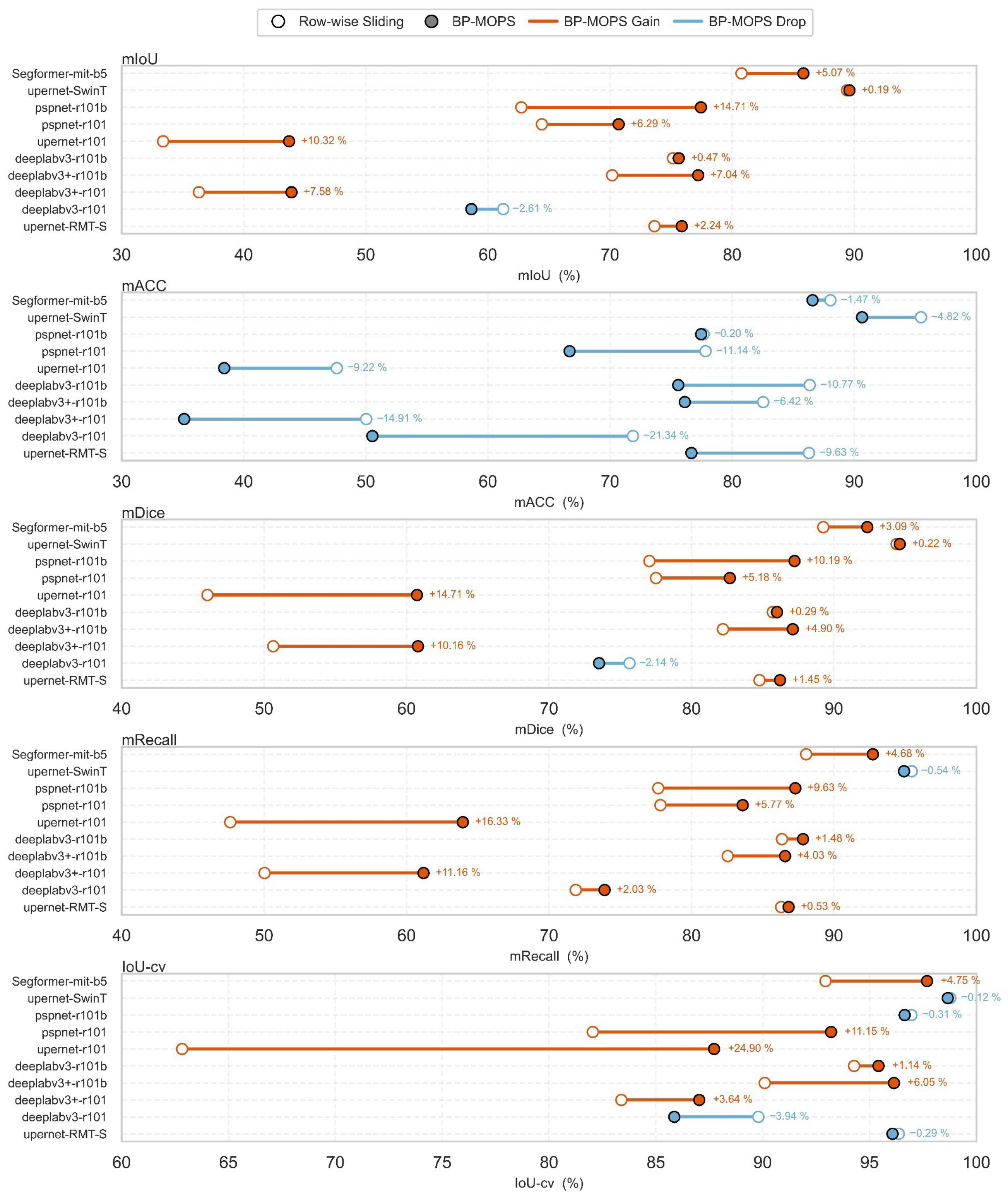 p < 0.001). These findings suggest that the BP-MOPS strategy enhances the model’s ability to capture complex spatial features, especially in fragmented regions and along field boundaries, which are critical for accurate segmentation in agricultural environments. Additionally, DeepLabv3 (r101) and Segformer-mit-b5 show consistent improvements in Dice coefficient and recall, with changes ranging from 0.126 to 0.147 for Dice and 0.169 to 0.183 for recall, all of which are statistically significant (