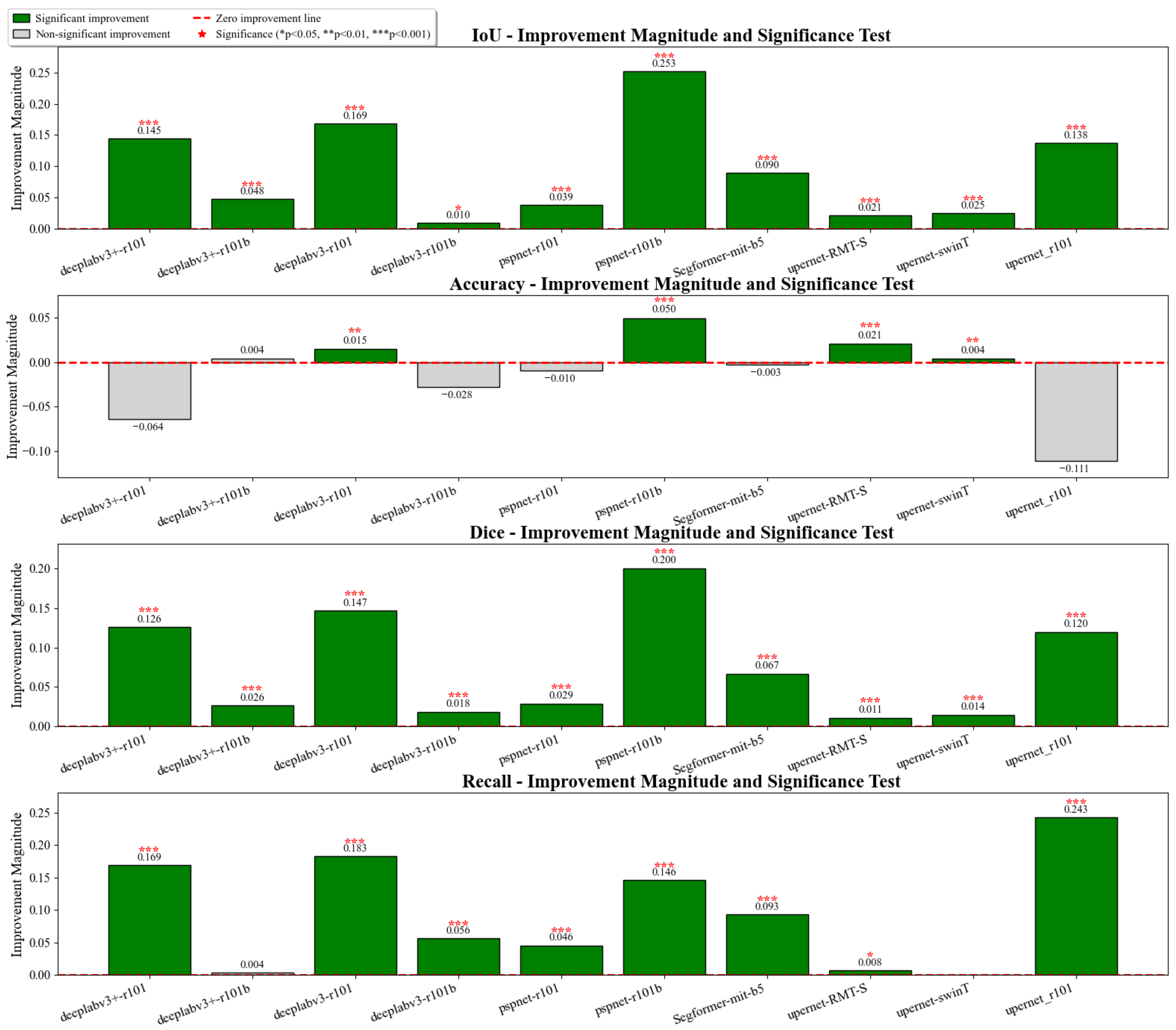 Figure 10), particularly in boundary-sensitive metrics such as IoU, Dice coefficient, and recall. For instance, DeepLabv3+ (r101) and PSPNet (r101b) exhibit notable improvements in mIoU, with differences of 0.145 and 0.253, respectively, both of which are highly significant (