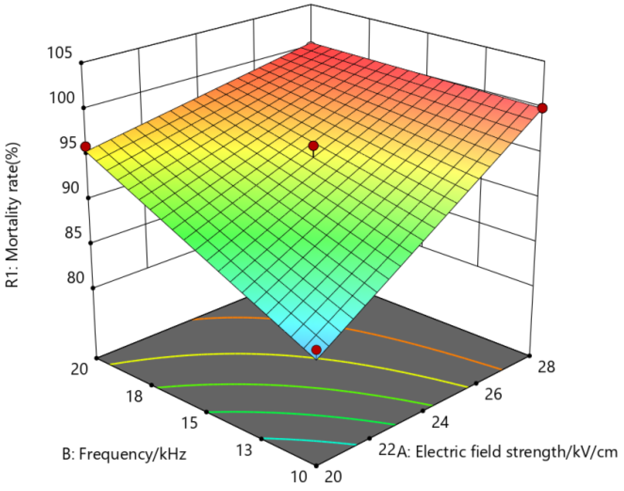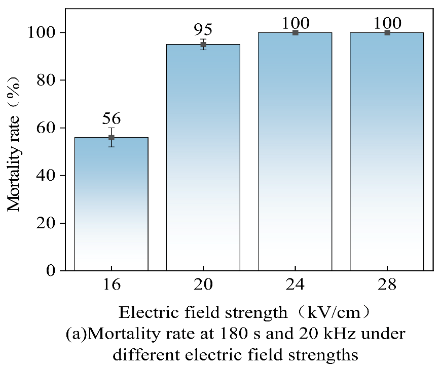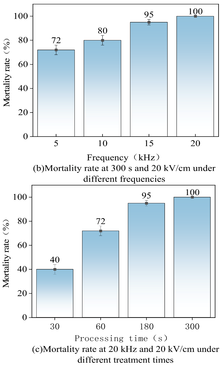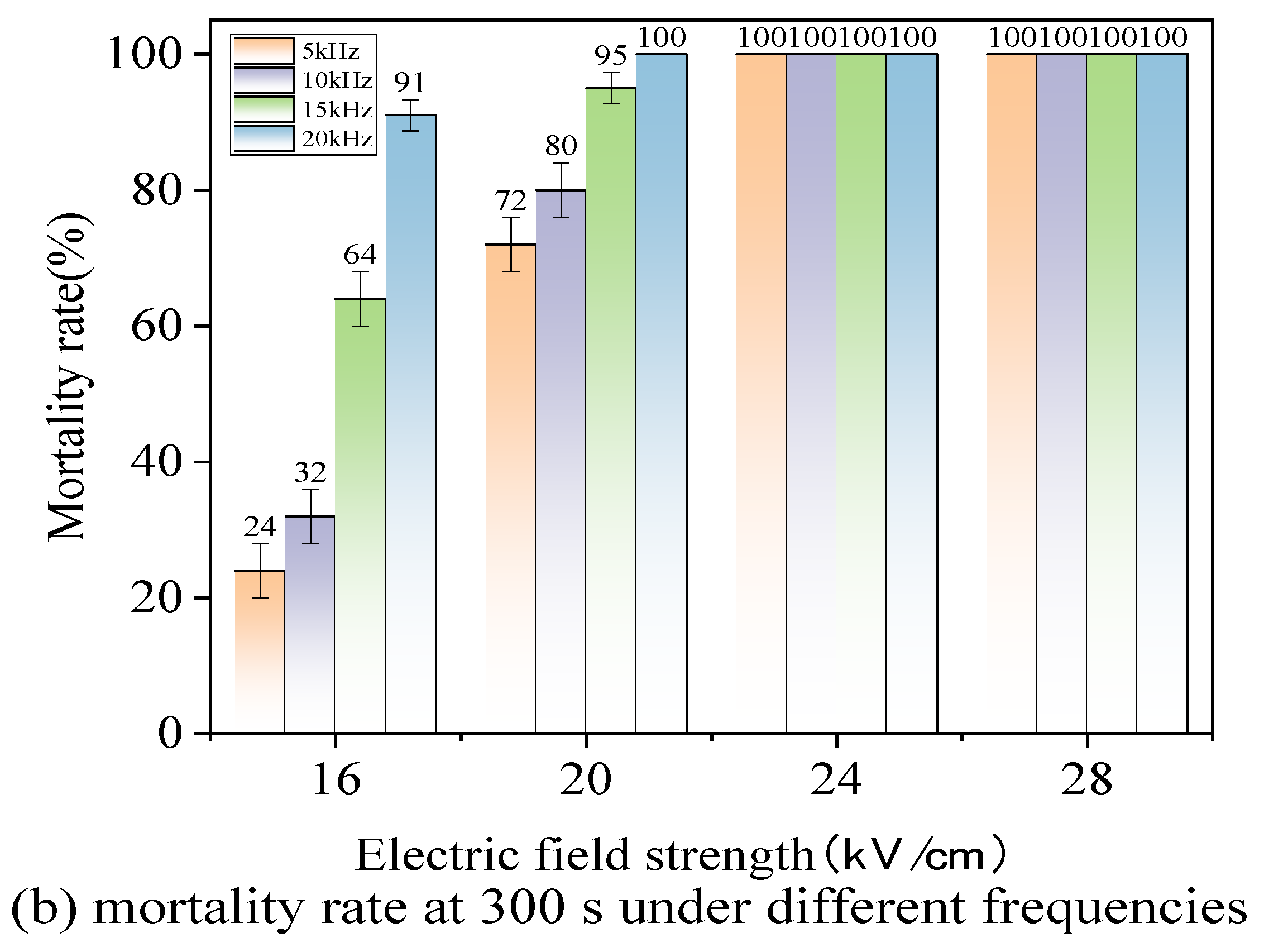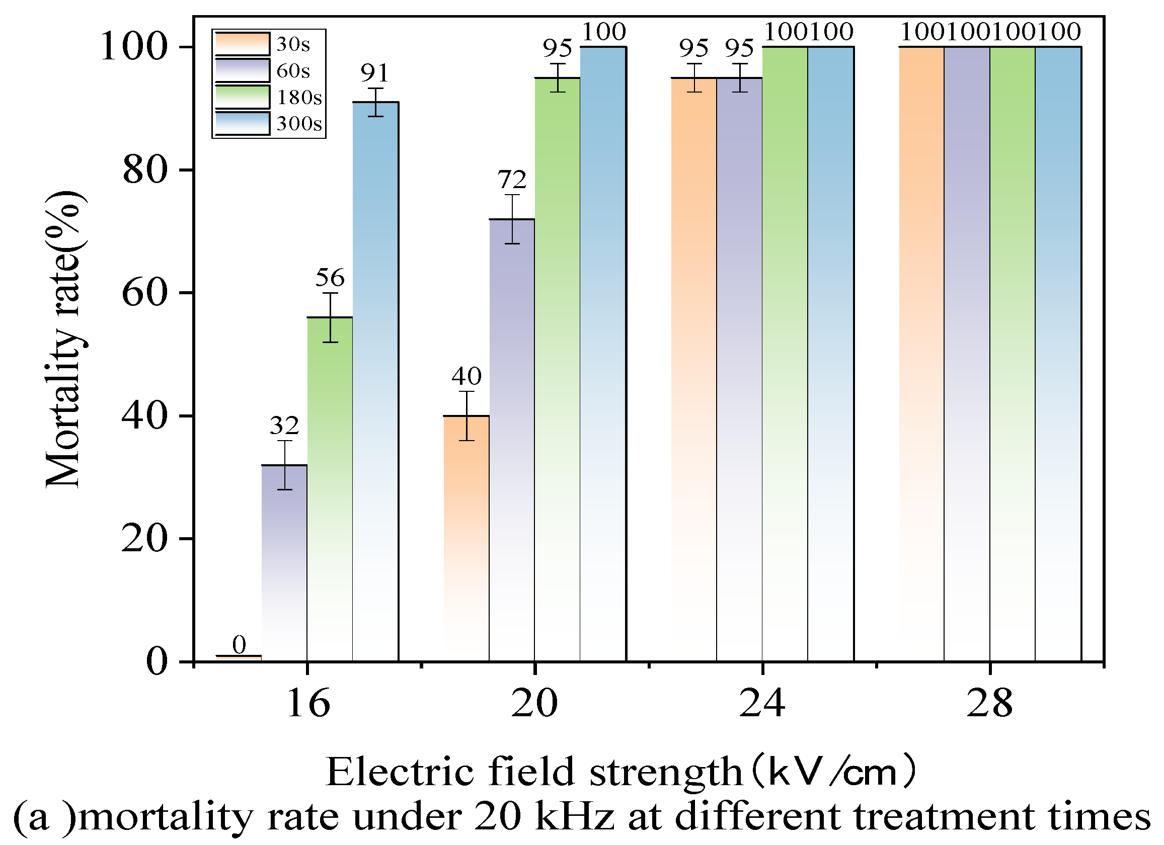 | No. | Electric Field Strength/(kV/cm) | Frequency/(kHz) | Processing Time/(s) | Mortality Rate/(%) |