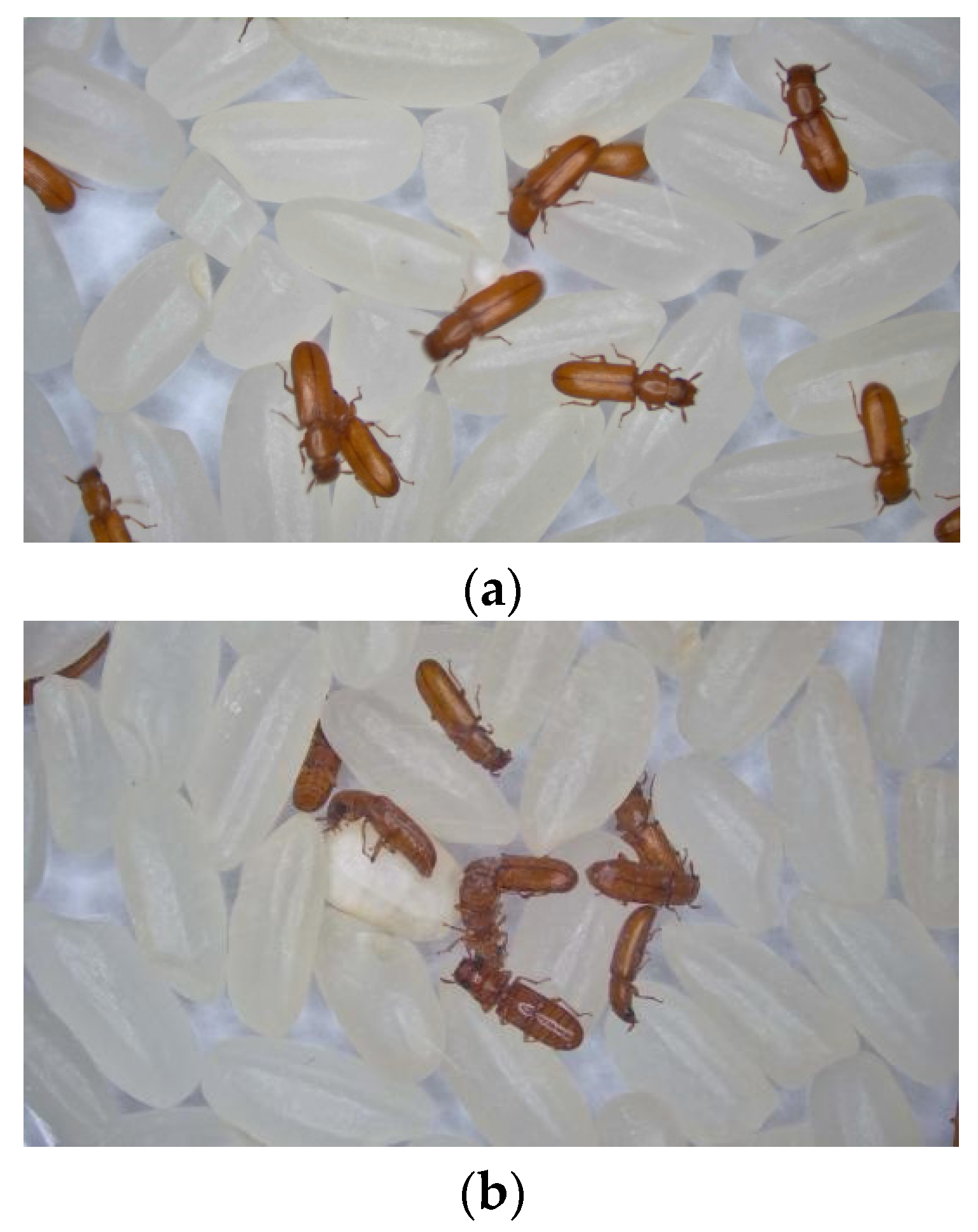 - Campbell, J.F.; Athanassiou, C.G.; Hagstrum, D.W.; Zhu, K.Y. Tribolium castaneum: A model insect for fundamental and applied research. Annu. Rev. Entomol. 2022, 67, 347–365. [Google Scholar] [CrossRef]