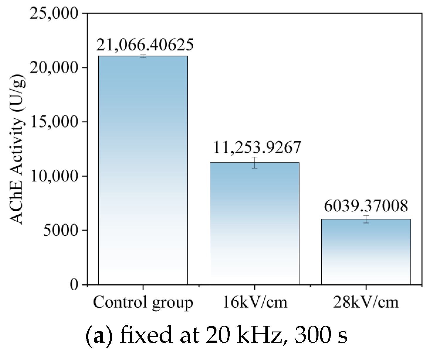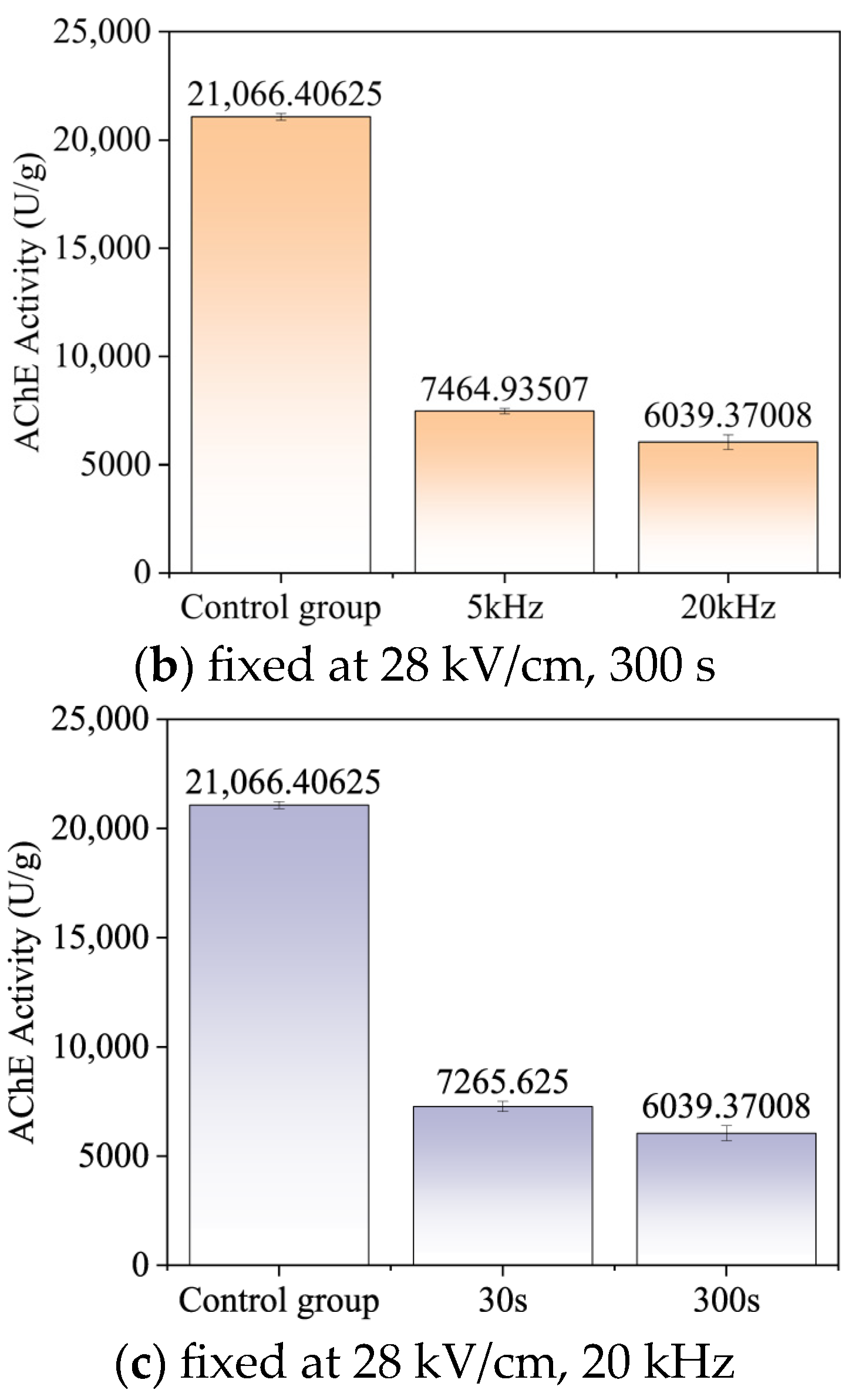 - Biochemical Cascades and acetylcholinesterase (AChE) Inactivation. Electroporation immediately disrupts cellular homeostasis, triggering catastrophic biochemical cascades that directly or indirectly lead to AChE inactivation. First, electroporation causes a loss of control over ion channels, disrupting the balance of ions such as Na+ and K+, which interferes with normal neural signal transmission (causing immediate paralysis) [36]. Second, it induces a massive influx of extracellular Ca2+ (i.e., “calcium overload”) and triggers cellular “oxidative stress” [37,38]. The significant decline in AChE activity observed in Section 3.4 is the biochemical consequence of these cascades. We hypothesize that the inactivation occurs via three pathways: