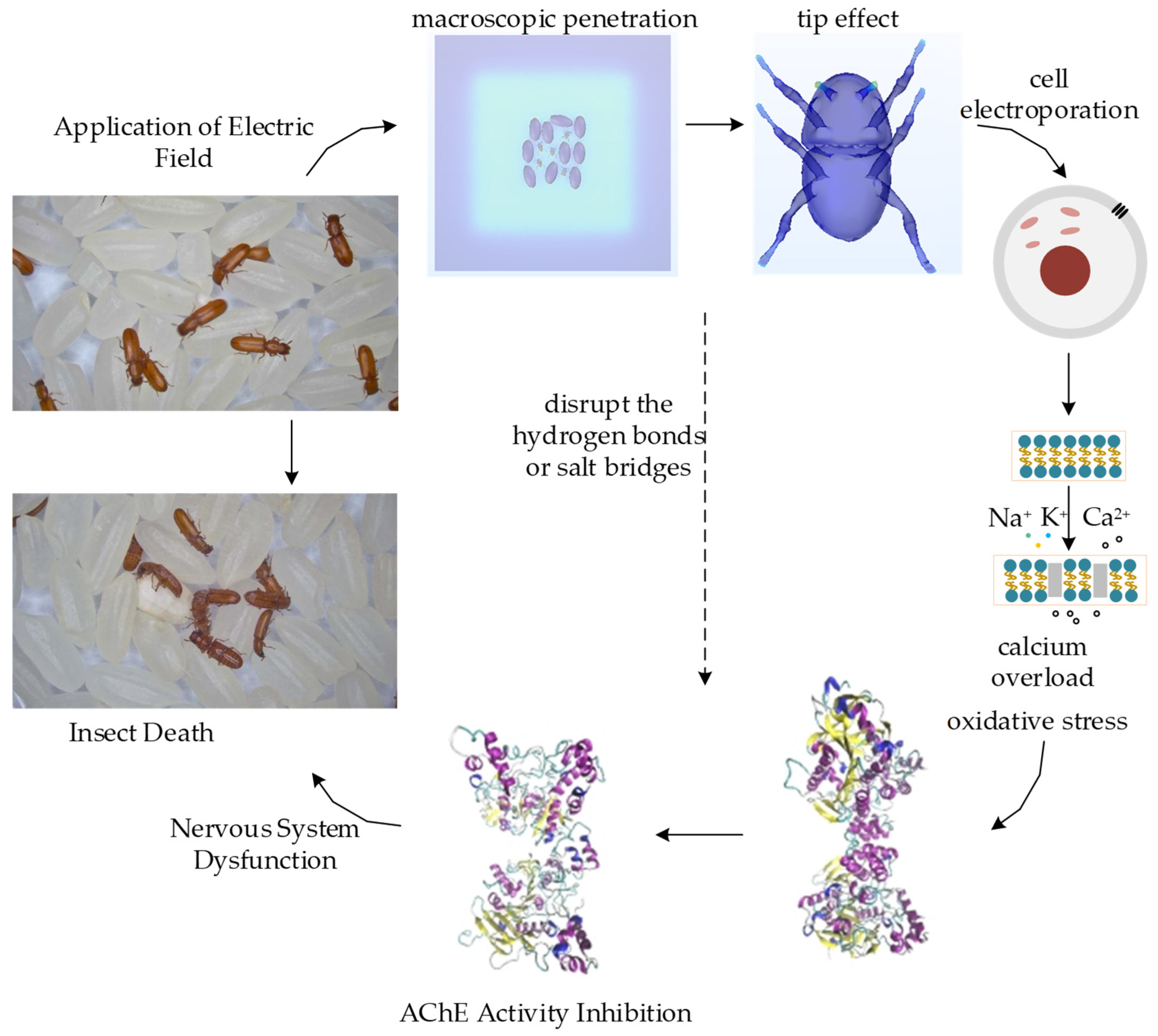 - Comparison with Chemical Control Mechanisms. This pathway shares similarities with the mechanism of organophosphorus insecticides, as both target AChE, but their triggering modes are fundamentally different [39,40]. Chemical insecticides inhibit enzymes via covalent binding of small molecules. In contrast, PEF operates through an “electric field-neurotoxicity” coupled pathway: the physical field causes enzymatic damage either directly or indirectly through electroporation-induced biochemical cascades. This reveals that PEF, as a physical insecticidal technology, operates on a more direct principle without chemical residue risks, providing theoretical support for its application as a green and sustainable strategy for stored grain pest control.