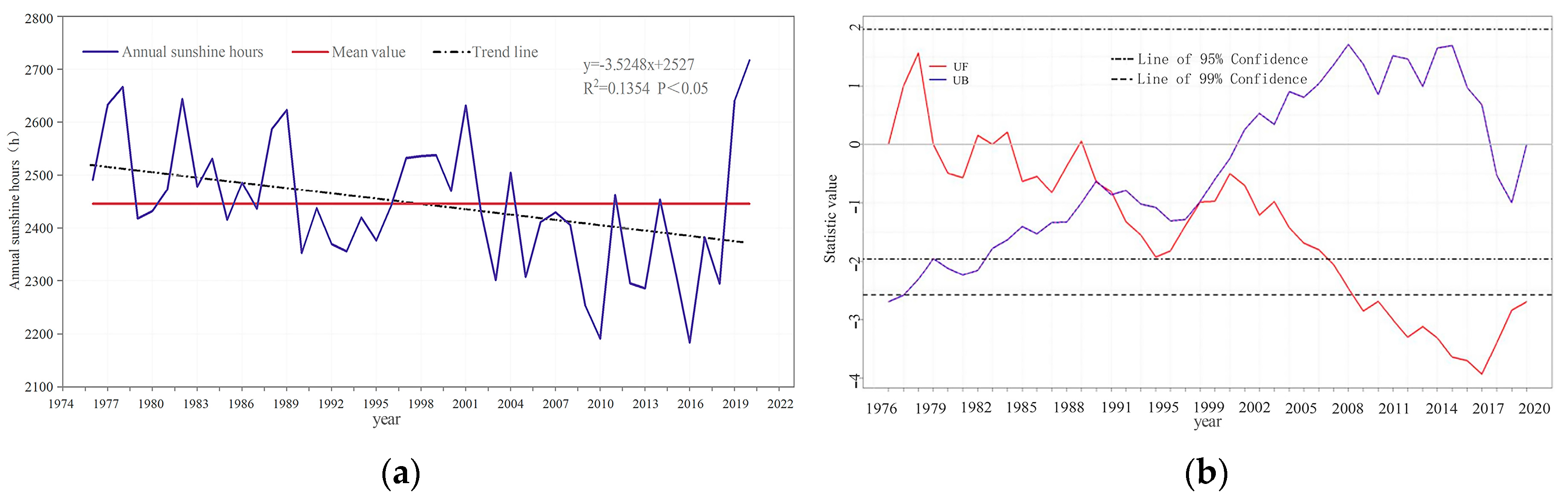 3.1. Temporal Variation Characteristics and Abrupt Change Analysis of Major Climatic Factors in Jilin Province