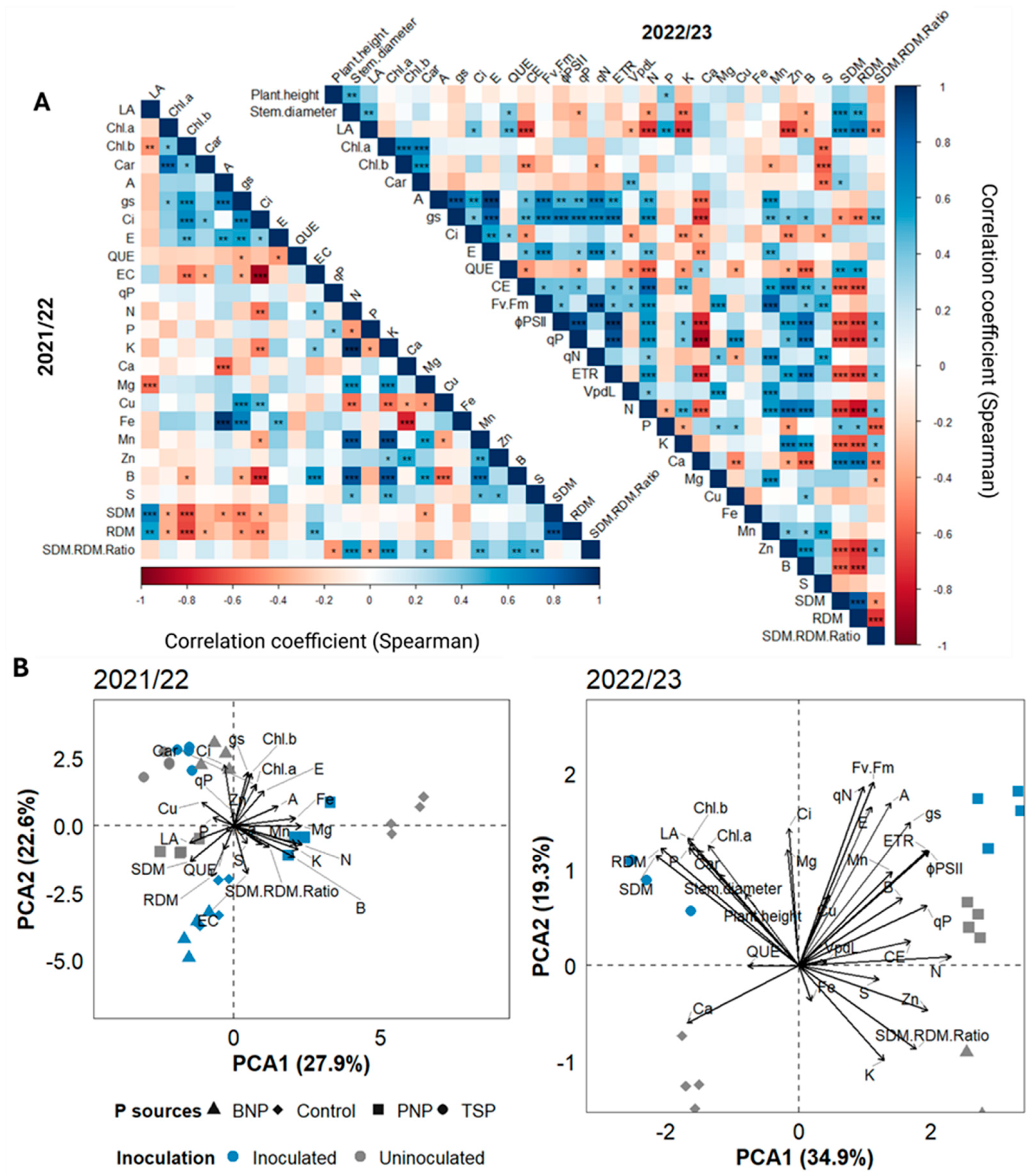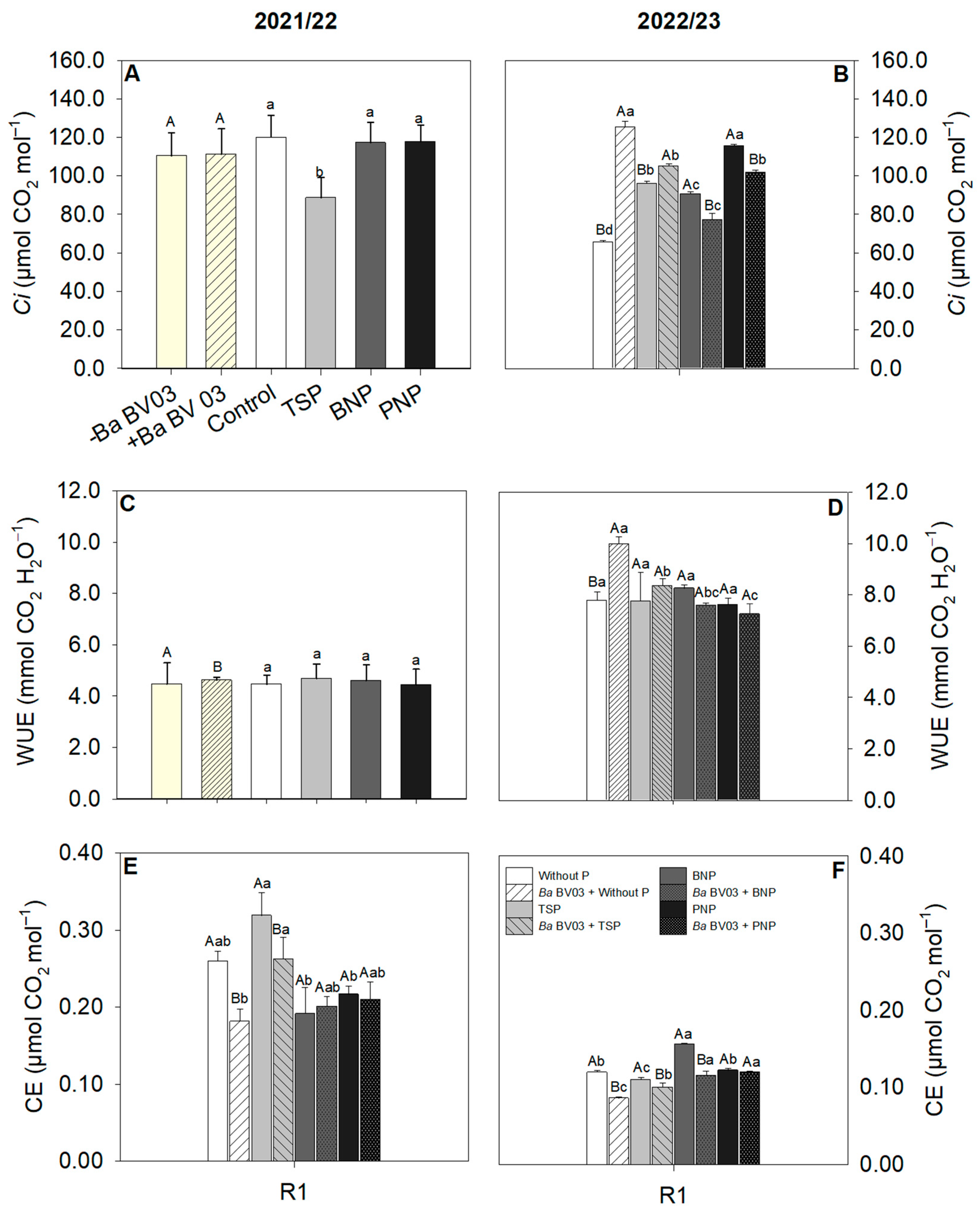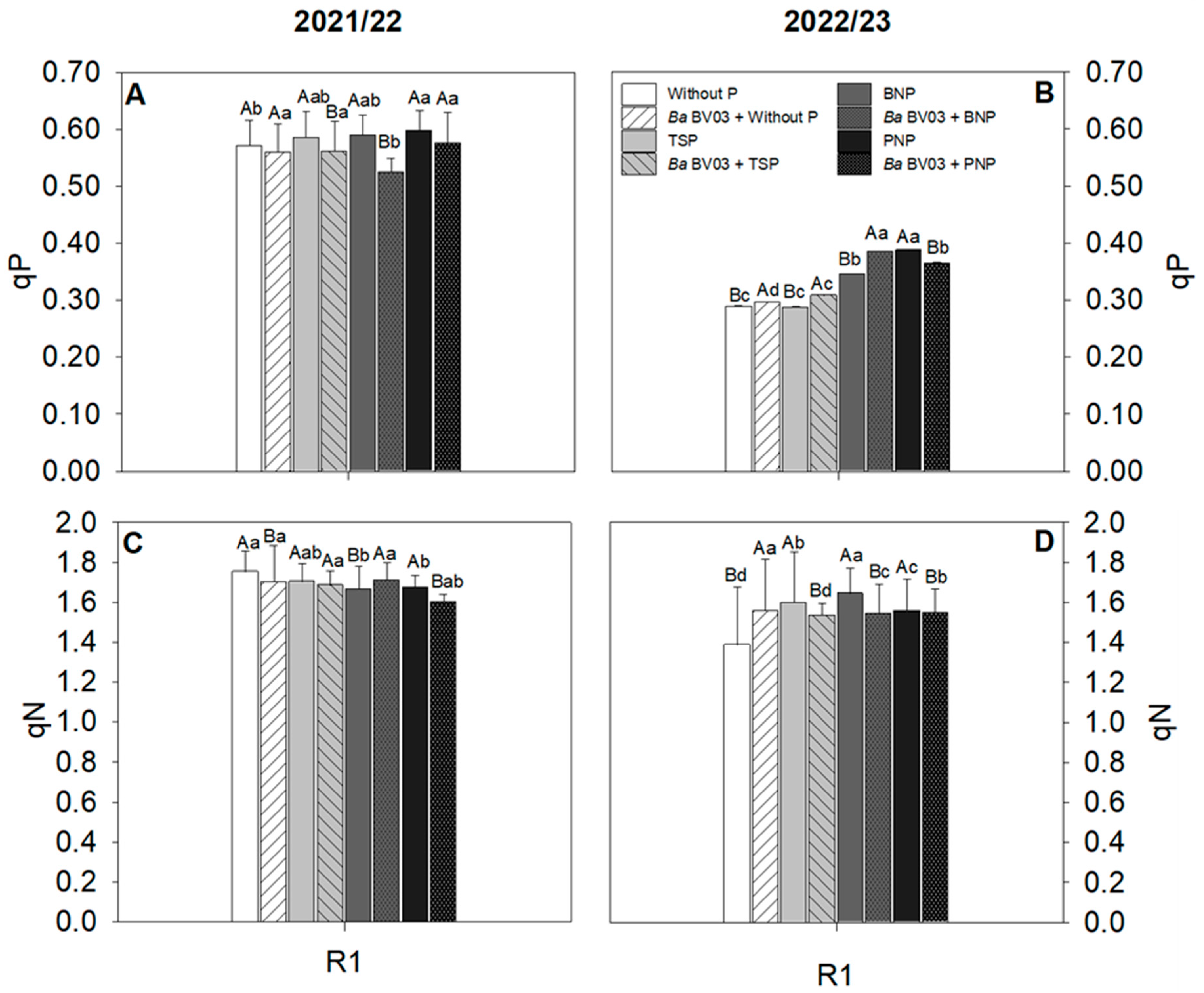 3.2. Impact of Bacillus amyloliquefaciens Inoculation and Phosphorus Sources on Corn Physiology