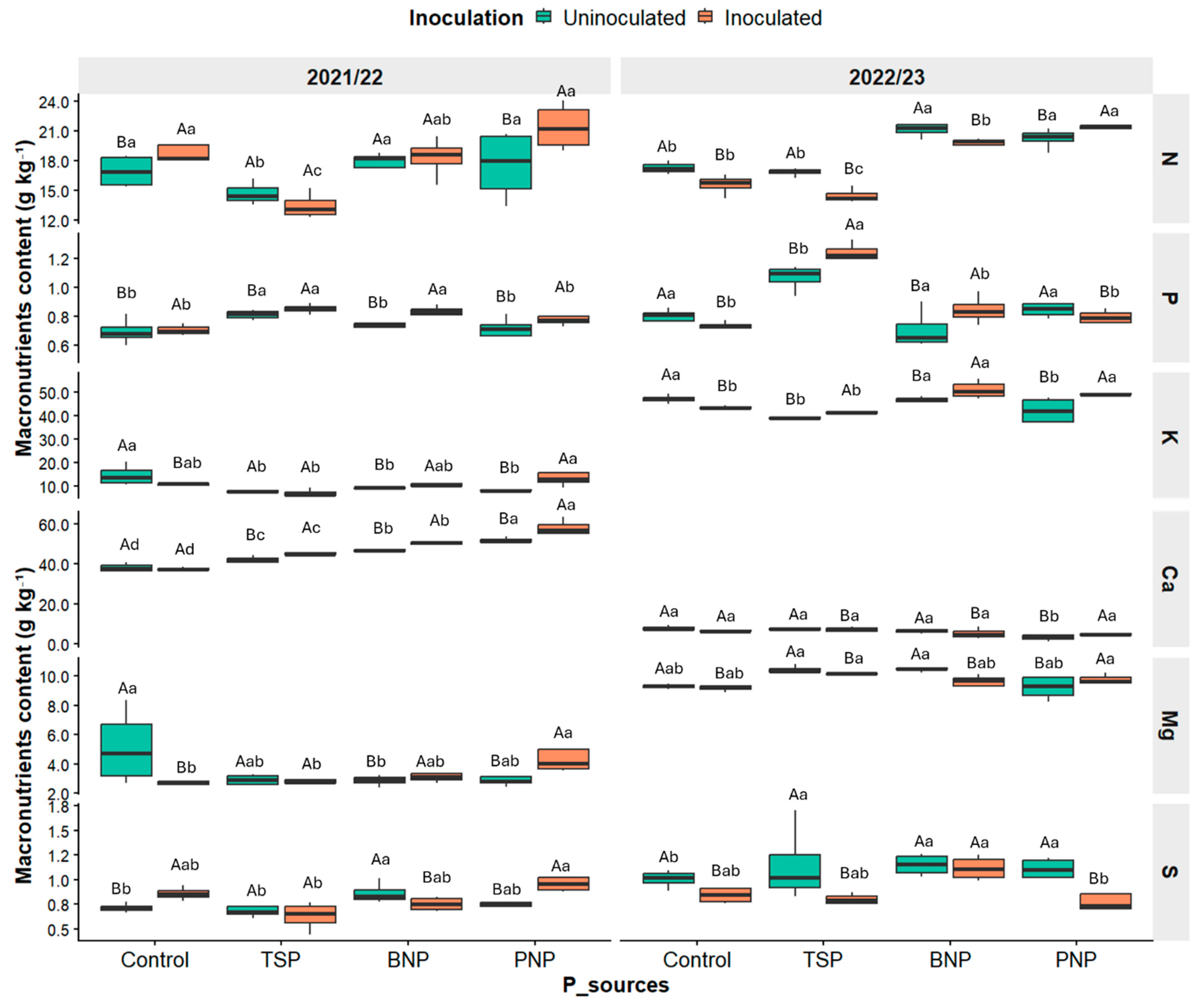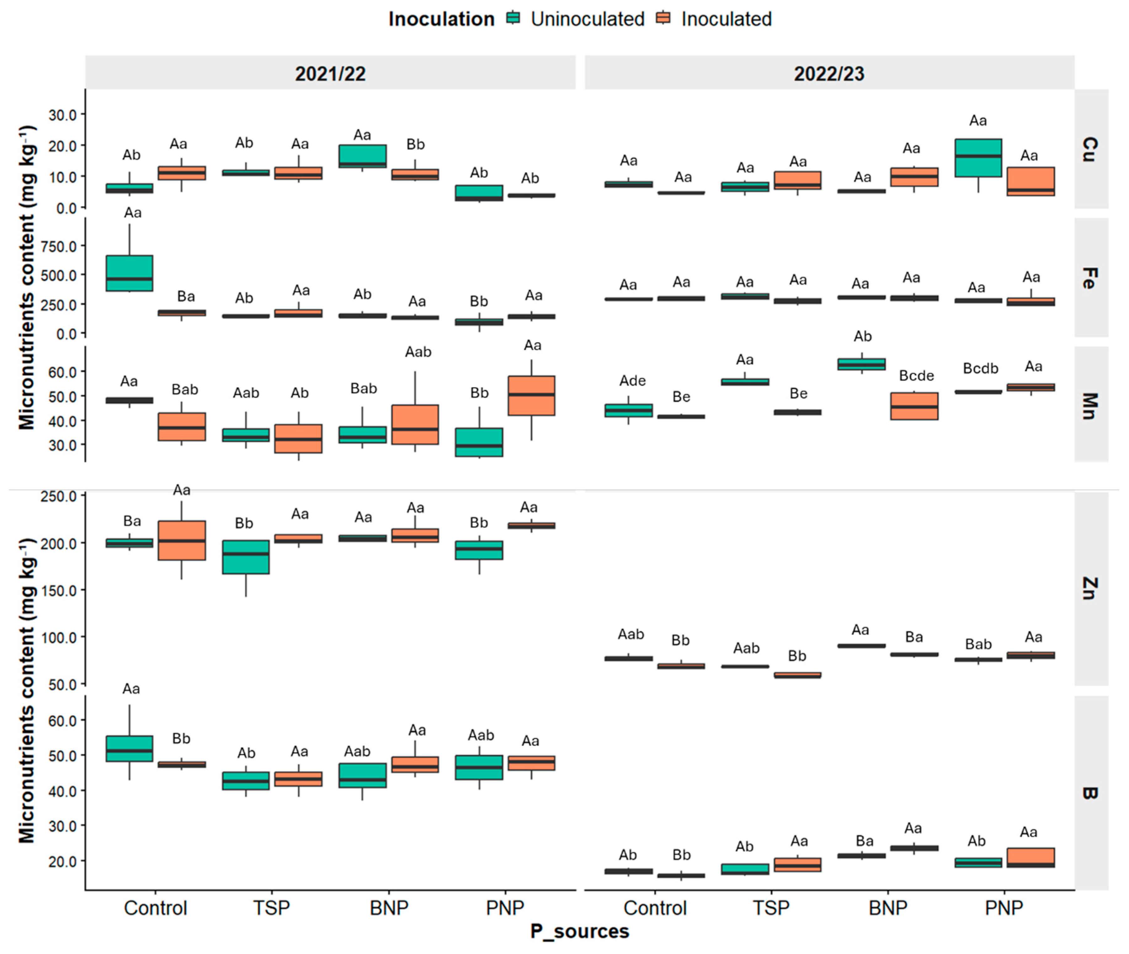 4.3. Effects of Bacillus amyloliquefaciens Inoculation and Phosphorus Sources on Nutritional Status