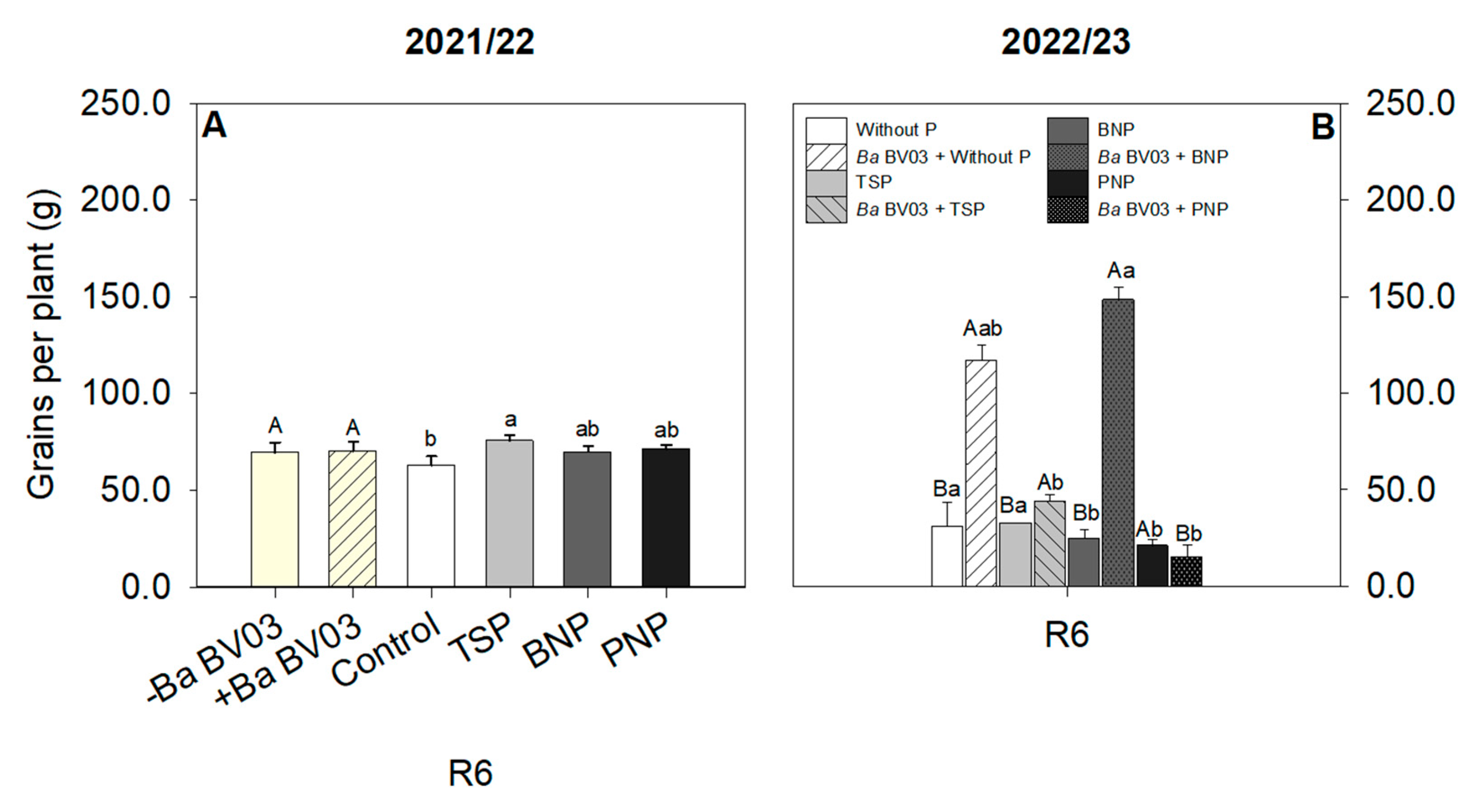 4.4. Effects of Bacillus amyloliquefaciens Inoculation and Phosphorus Sources on Plant Biomass and Yield of Corn