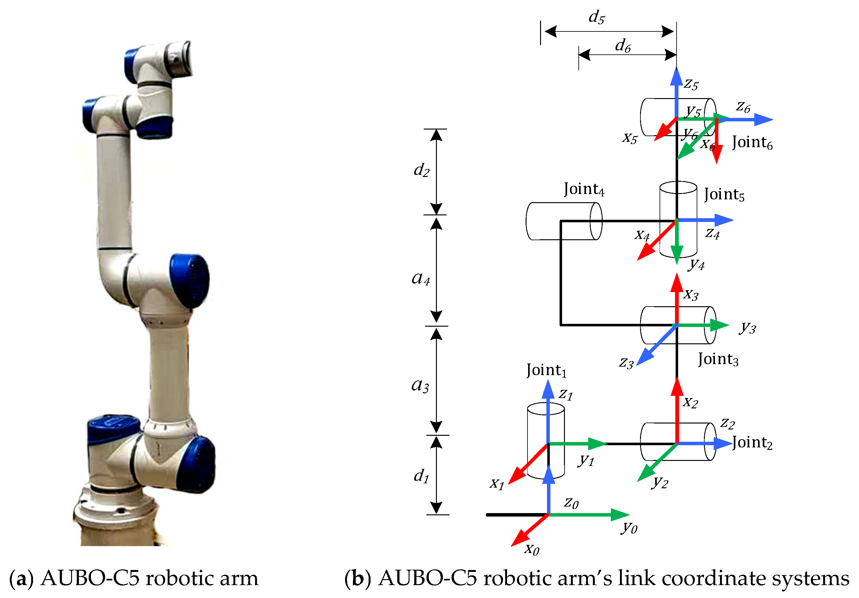 Figure 2. AUBO-C5 robotic arm and its link coordinate systems.