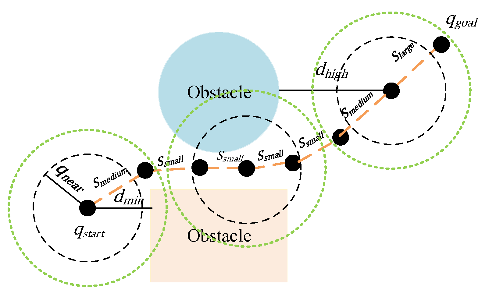 In this context, S b a s e is the predefined base step size. S l a r g e is a larger candidate step size used in open environments. S m e d i u m represents a moderate step size applied in areas with intermediate complexity. S s m a l l is a smaller step size, mainly used in regions with dense obstacles or when approaching the target point. As illustrated in Figure 4.
