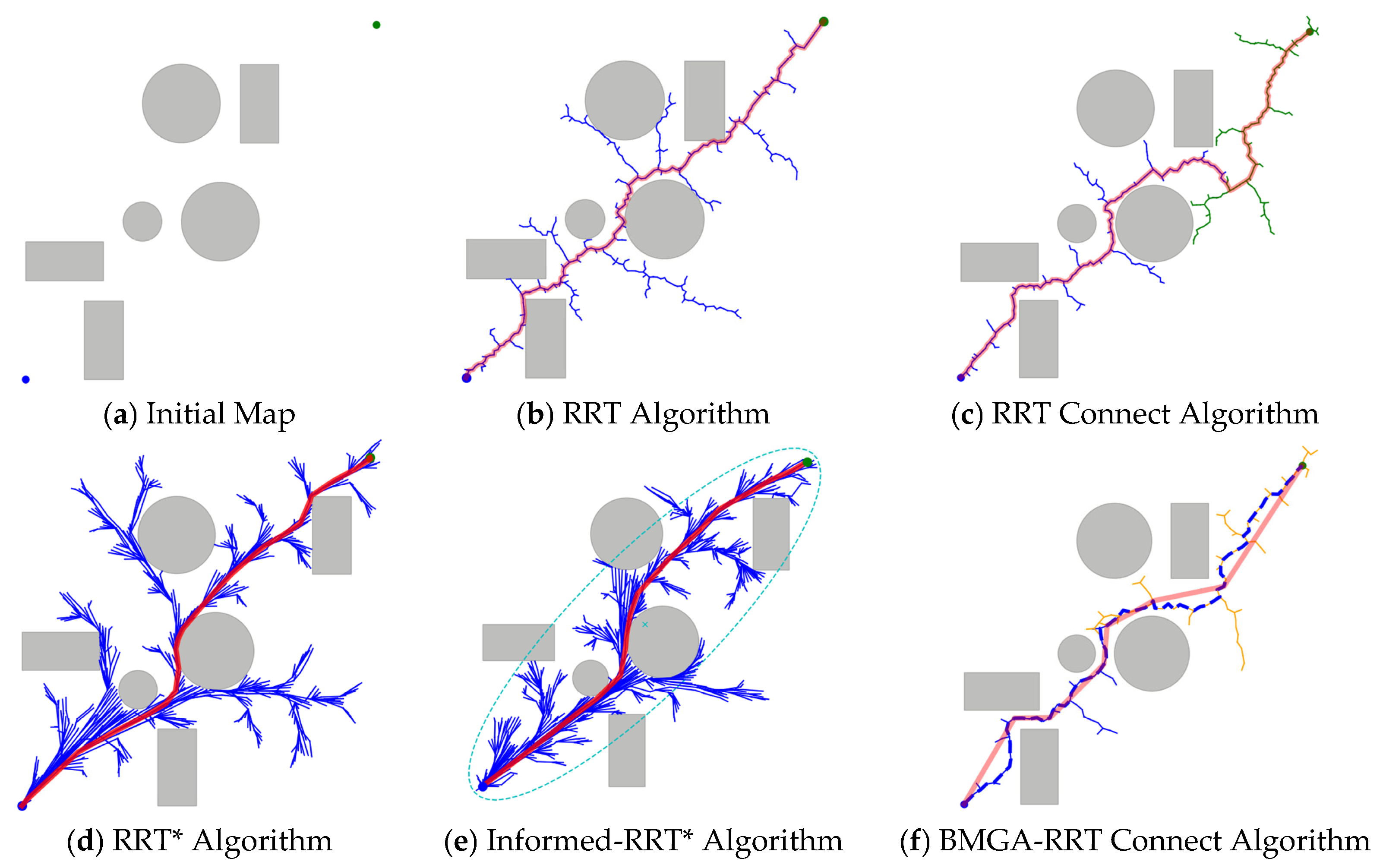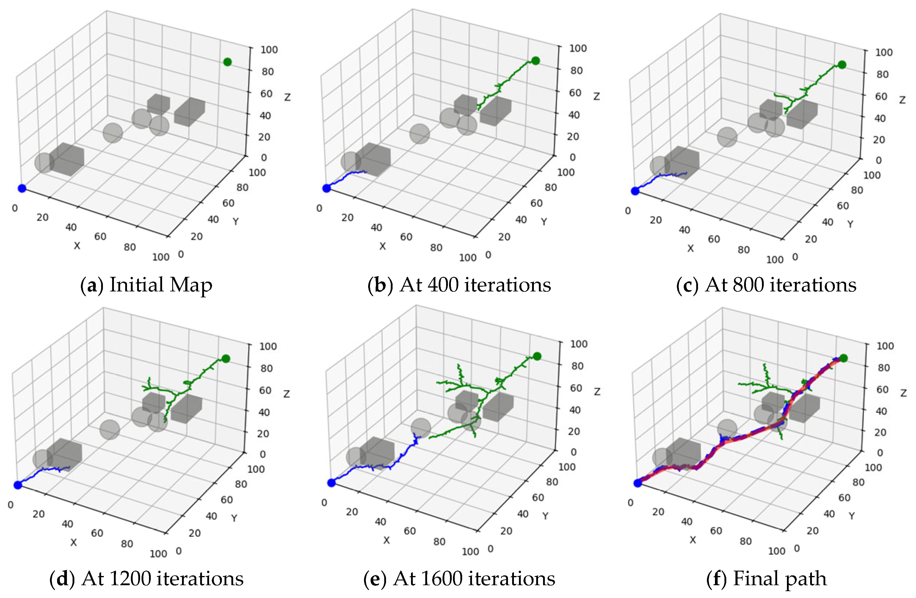 28. Li, M.; Shan, L.; Wu, Z.; Wang, W. An Adaptive Multimodal Enhanced RRT* Path Planning Algorithm Based on Node Collision Feature Calculation Model. In Proceedings of the 2024 IEEE International Conference on Unmanned Systems (ICUS), Nanjing, China, 18–20 October 2024; pp. 982–988. [Google Scholar]