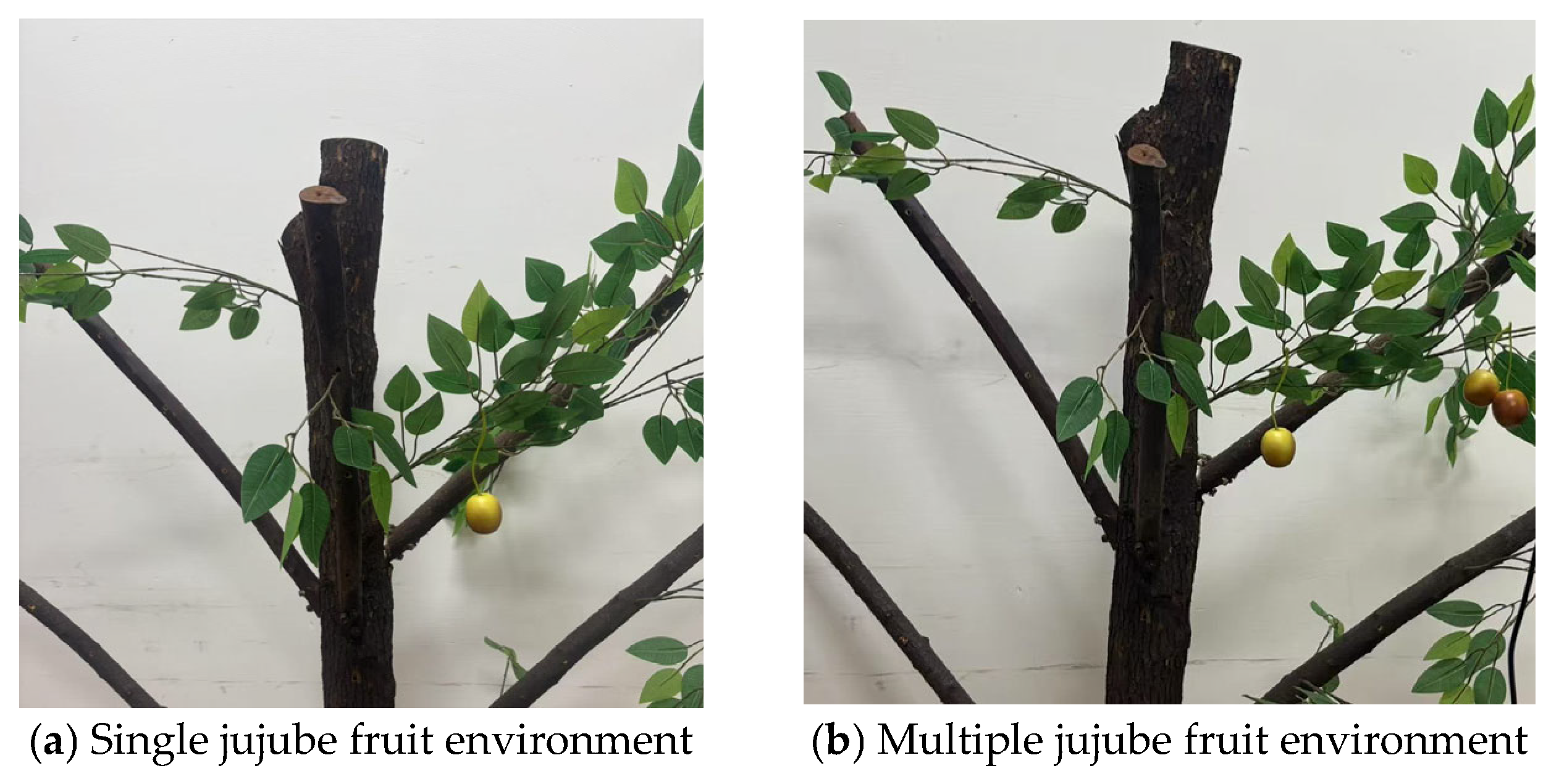 Winter jujube harvesting is a labor-intensive and seasonal operation that mainly relies on manual picking [1]. However, with the aging population and rising labor costs, crop production costs continue to rise, and the market competitiveness of agricultural products is gradually declining. In order to reduce production costs and improve product competitiveness, robotic arm picking is becoming an important development trend in the field of winter jujube harvesting [2].