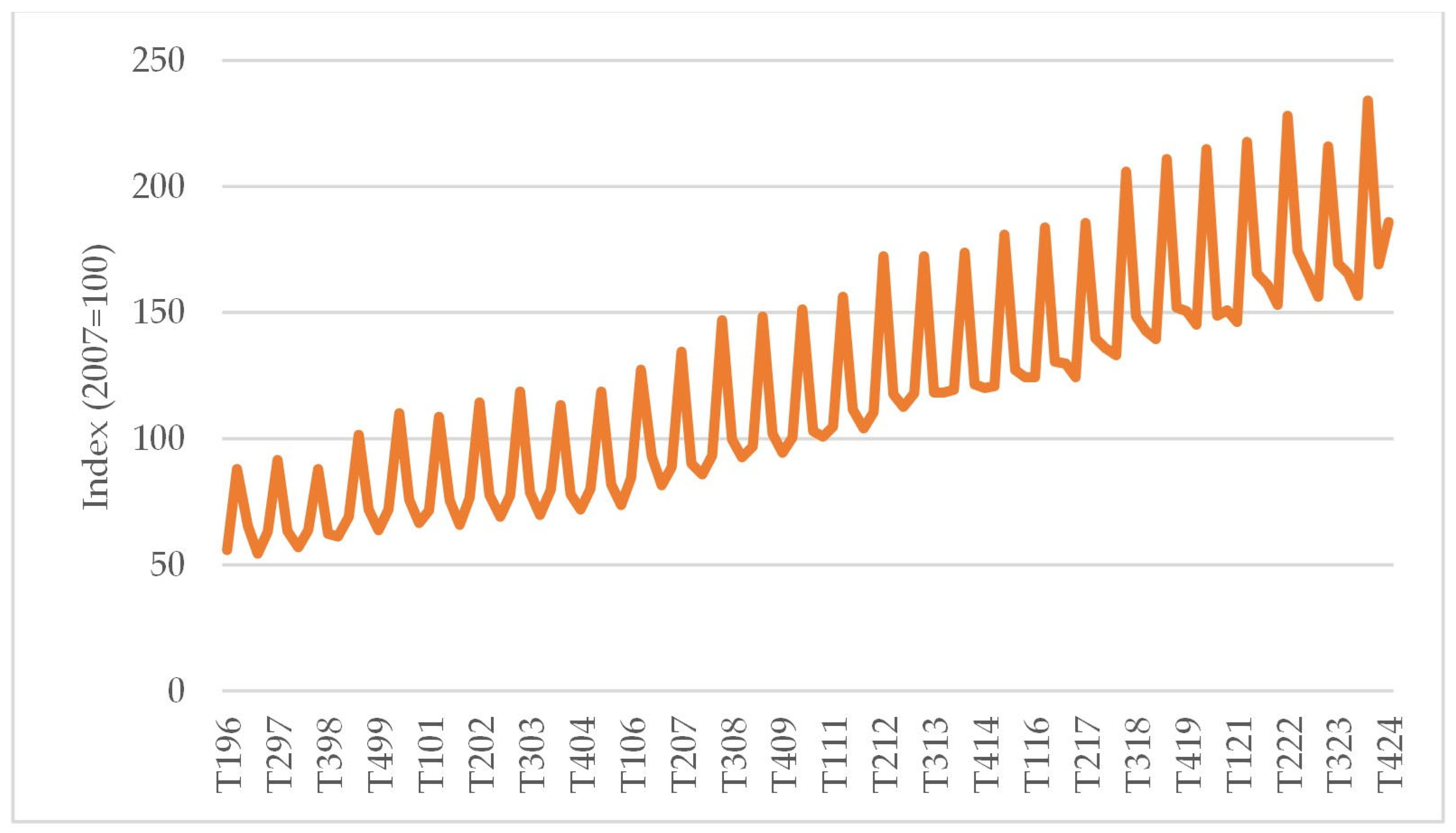 71]. Hence, inference relies on the model’s asymptotic properties rather than on strict multivariate normality. Finally, the possibility of a break associated with COVID-19 was assessed. The deseasonalised agricultural GDP series shows no discontinuities in 2020, and institutional evidence indicates that the sector exhibited notable resilience [
