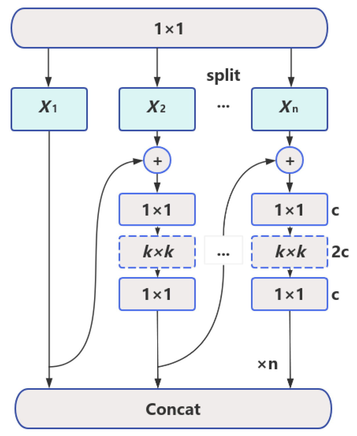 In order to overcome the shortcomings of C3k2, we introduce MsBlock, whose core idea is to use multi-scale convolution kernels to extract feature information of different scales in parallel, and then improve the detection ability through the fusion mechanism. The calculation process of the MsBlock structure is as follows: