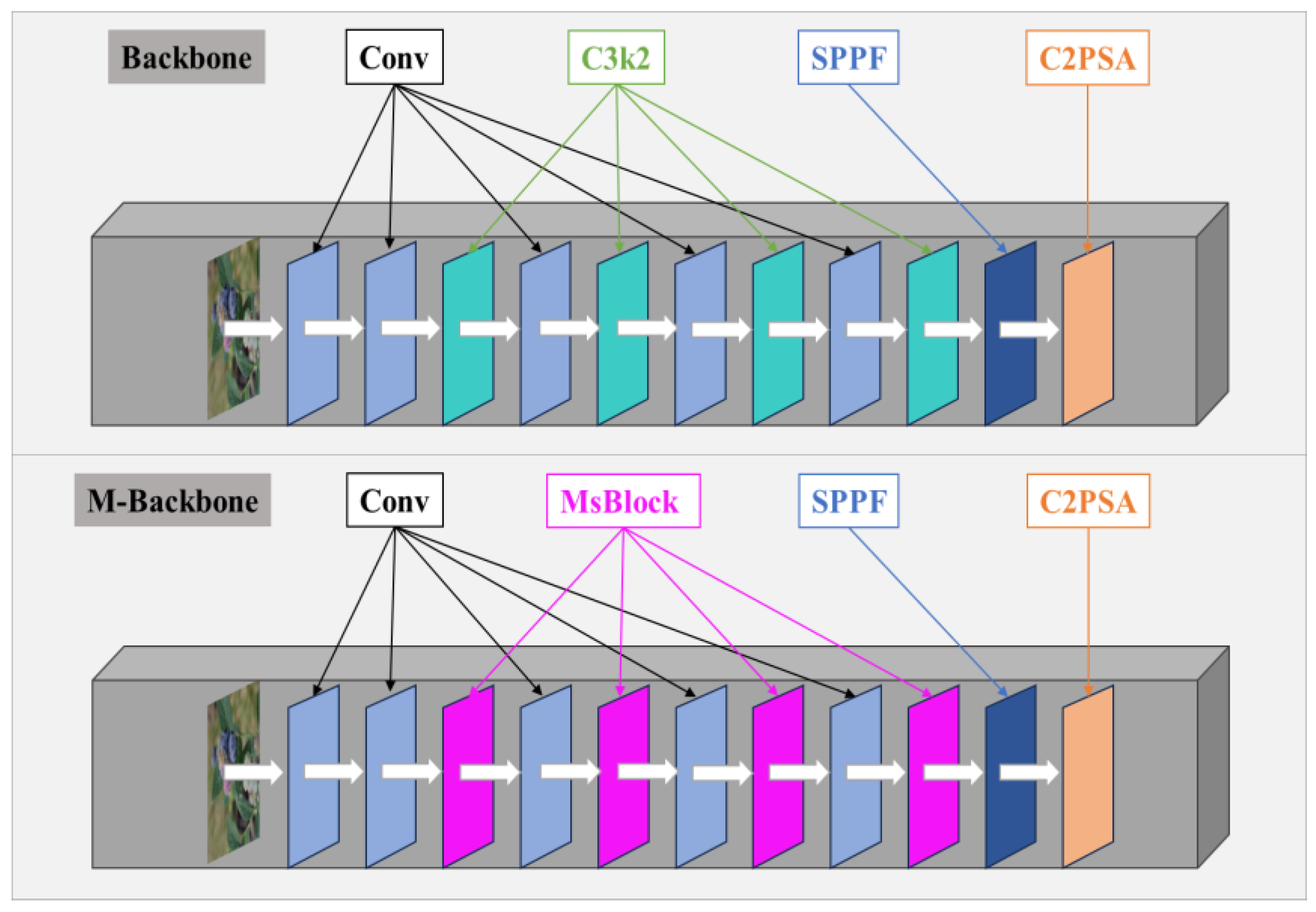 In M-YOLOv11n, the MS-Block is integrated into the backbone network (