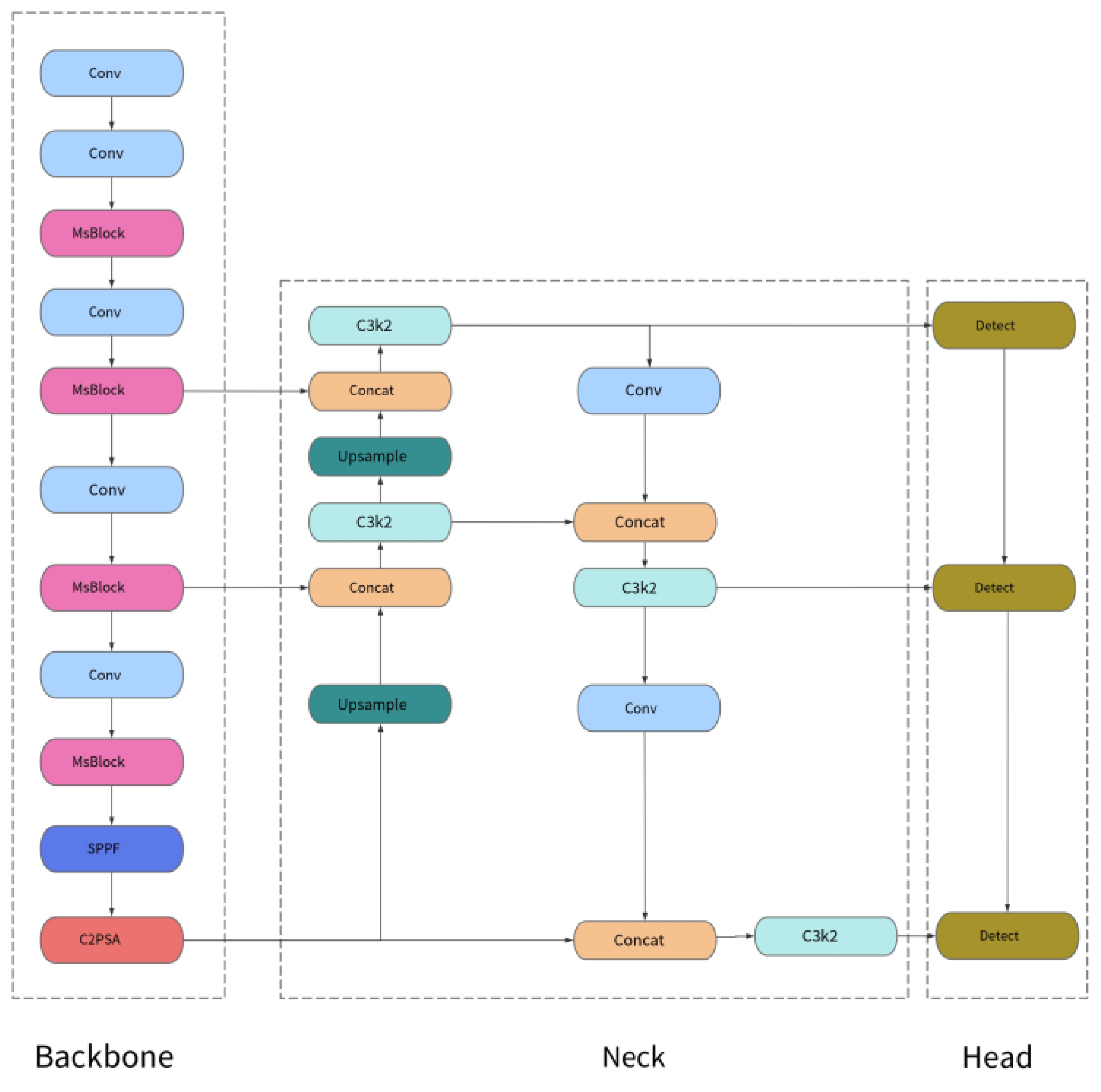 Table 3, three MsBlock stages output feature maps with resolutions of 1/8, 1/16, and 1/32, which are further forwarded to the neck network for multi-scale feature fusion and detection. The remaining MsBlock operates at a higher-resolution stage to enhance shallow feature representation and is not directly connected to the detection heads. The network structure diagram is shown in