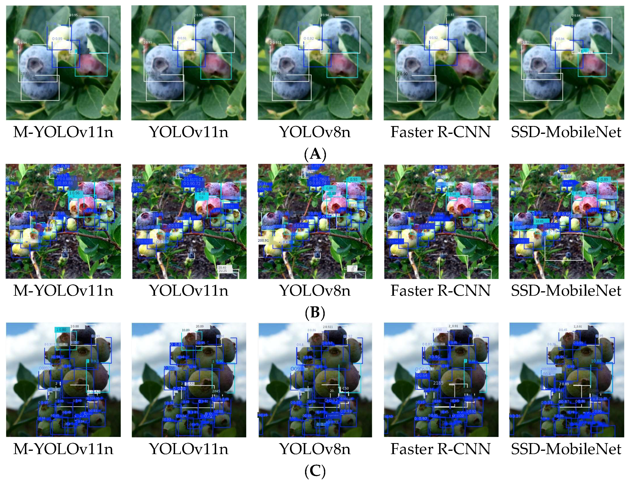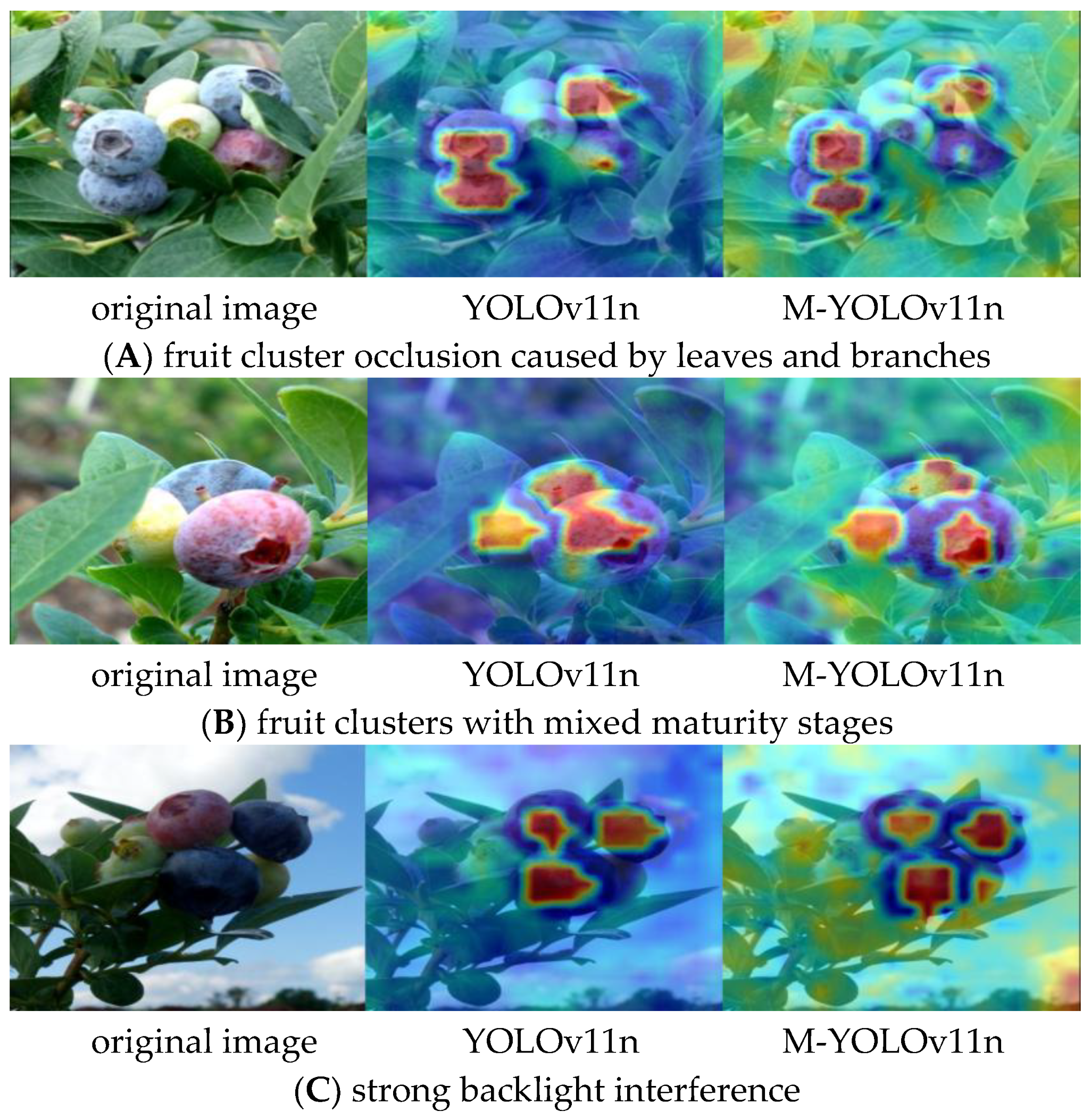 16]. However, when deployed in complex natural environments characterized by factors such as occlusion, varying lighting conditions, and significant scale variation among fruits, these models often face challenges in maintaining robust accuracy while meeting the stringent requirements for real-time processing and lightweight deployment essential for practical agricultural applications. To address these specific challenges, this study proposes the M-YOLOv11n network. Building upon the efficient YOLO framework, our work introduces key structural innovations. The novelty of M-YOLOv11n lies in its integrated approach, which strategically incorporates a multi-scale feature extraction module and an attention mechanism within a lightweight architecture. This design aims to enhance feature discrimination for blueberries under challenging conditions without substantially increasing computational cost, thereby advancing the balance between accuracy, robustness, and efficiency for in-field maturity detection. For example, Zhang et al. proposed a fruit detection method based on Faster R-CNN and achieved more than 90% accuracy in the detection task of apples and oranges [