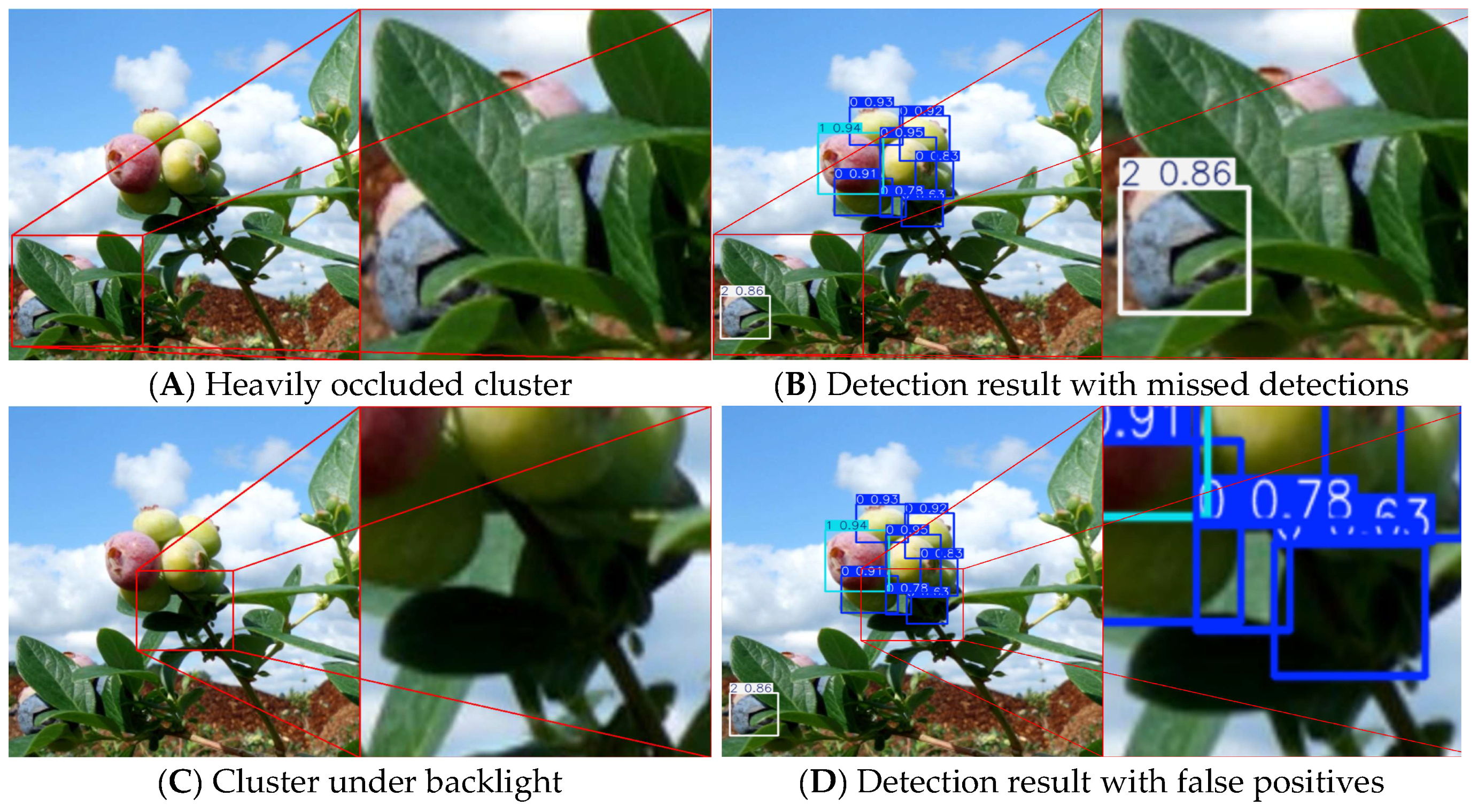 The M-YOLOv11n model proposed in this study demonstrated superior detection accuracy and real-time performance in natural environments, but still has some notable limitations. Firstly, at the commercialization and practical deployment level, although the model has the characteristic of being lightweight, integrating it into actual agricultural production processes (such as robot harvesting or post-harvest sorting lines) still requires addressing numerous engineering issues. As a robot-mounted perception system, its performance needs to be systematically verified on mobile platforms, vibration disturbances, and different lighting periods, and it must meet the extremely low latency requirements for harvesting action planning. In the application of sorting lines, the camera installation position, production line speed, and the software and hardware coordination with existing sensors (such as weighing and spectrometers) need to be considered. Additionally, the long-term maintenance of the model after deployment is also crucial, including: dealing with the possible regular re-training or domain adaptation required when different production areas have different lighting conditions, variations in blueberry varieties (fruit size, fruit frost, color depth), and when considering the need for regular re-training or domain adaptation; establishing calibration procedures for different camera models and installation positions; and evaluating the model’s robustness to common on-site disturbances such as lens stains and dust. Secondly, in terms of the generalization and transferability of the model, the dataset used in this study comes from a fixed camera configuration on a single farm in Florida, USA, which covers complex scenarios such as occlusion and backlighting, but does not systematically cover the diverse varieties and cultivation patterns of major global production areas. The model’s adaptability to different blueberry varieties (especially those with significant differences in fruit skin luster or fruit frost characteristics) needs further verification. However, the core contribution of this study—that is, enhancing the model’s feature representation and discrimination ability in complex scenarios through multi-scale modules (MsBlock) and channel attention (SE)—has a universal design concept. Therefore, the proposed improved architecture is expected to be directly transferable to other small fruit detection tasks (such as grapes, cherries, strawberries) and non-fruit agricultural target detection tasks (such as pest and disease identification, flower counting) with similar detection challenges, but data collection and fine-tuning for specific target crops are required. These limitations indicate the direction for future research, which is to promote the model from laboratory performance verification to field engineering application and cross-crop generalization.