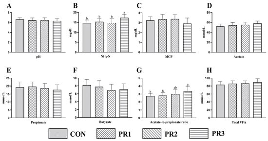 Effects of substitution of maize silage with mixed silage in the diet on the rumen fermentation characteristics of fattening lambs. (A) pH; (B) NH3-N; (C) MCP; (D) acetate; (E) propionate; (F) butyrate; (G) acetate-to-propionate ratio; (H) total VFA. NH3-N, ammonia nitrogen; MCP, microbial protein; VFA, volatile fatty acid. CON, diet without mixed silage; PR1, PR2 and PR3, 25%, 50% and 75% of maize silage in the diet substituted with a corresponding amount of mixed silage, respectively. Different small letters above the columns indicate significant differences (p < 0.05).
