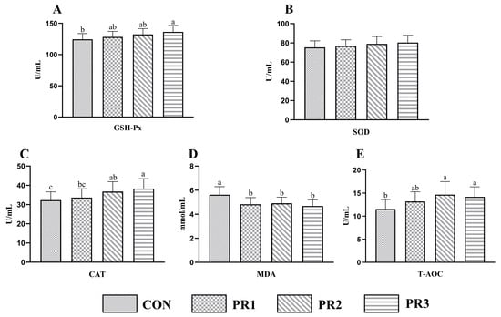 Effects of substitution of maize silage with mixed silage in the diet on serum antioxidant indices in fattening lambs. (A) GSH-Px; (B) SOD; (C) CAT; (D) MDA; (E) T-AOC. GSH-Px, glutathione peroxidase; CAT, catalase; SOD, superoxide dismutase; MDA, malondialdehyde; T-AOC, total antioxidant capacity. CON, diet without mixed silage; PR1, PR2 and PR3, 25%, 50% and 75% of maize silage in the diet substituted with a corresponding amount of mixed silage, respectively. Different small letters above the columns indicate significant differences (p < 0.05).
