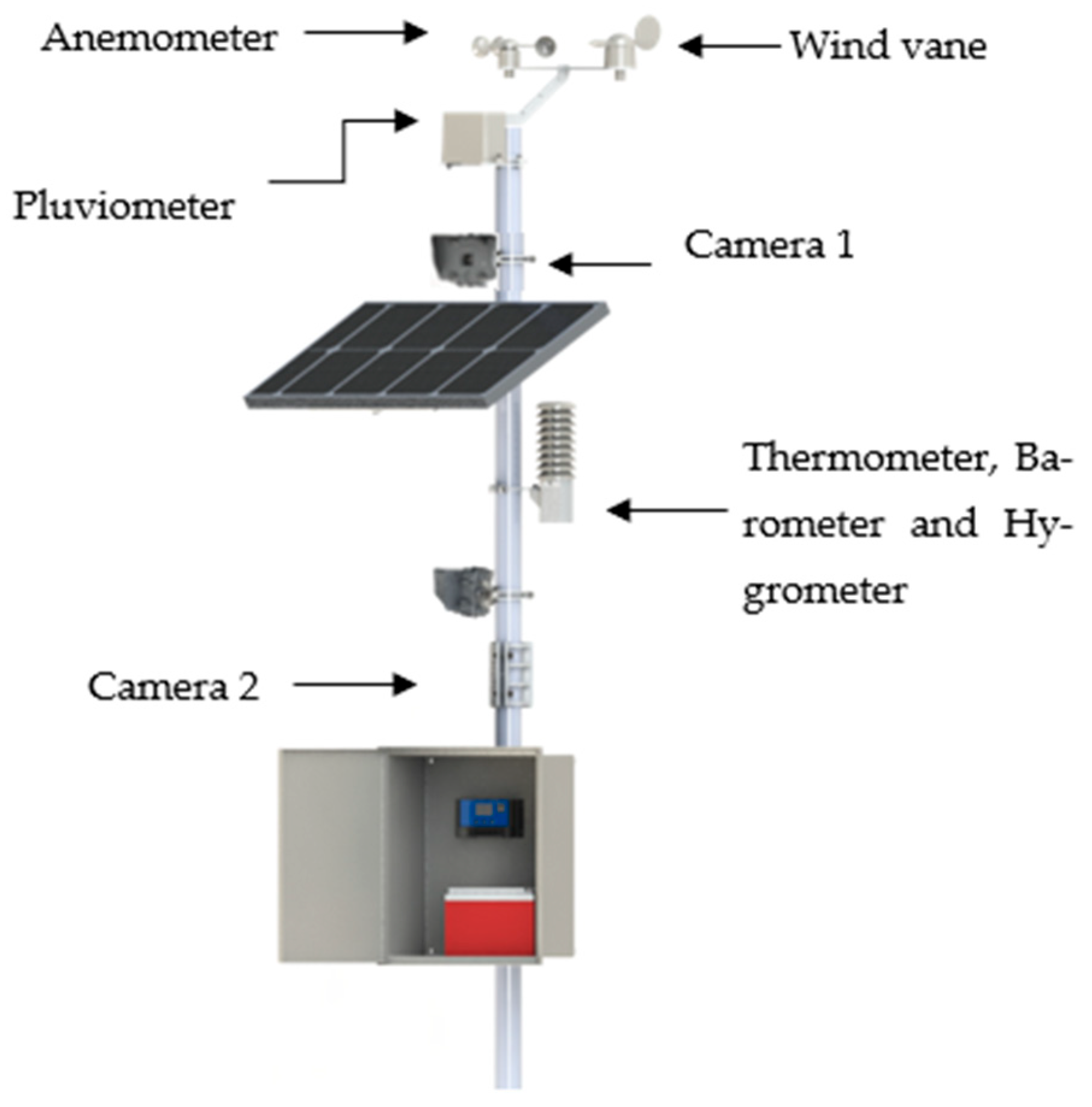 All digital sensors were used with the manufacturer’s factory calibration, and no additional laboratory calibration was performed prior to deployment. Field validation was limited to basic quality-control procedures, including range screening, step-change detection, and consistency checks between coupled variables (e.g., air temperature and relative humidity). In addition, the station’s meteorological time series were compared against expected regional conditions reported by the National Weather Institute (IPMA). The tipping-bucket rain gauge was levelled during installation. The temperature and humidity module was housed in a shaded, ventilated protective enclosure to reduce sun exposure and weather-related biases while maintaining exposure to ambient air. Cameras were installed in a dedicated protective housing with a brim to reduce rain and wind exposure and to limit direct solar glare that can degrade image quality. Camera placement and orientation were defined according to the target scene and the specific monitoring objective at each site.