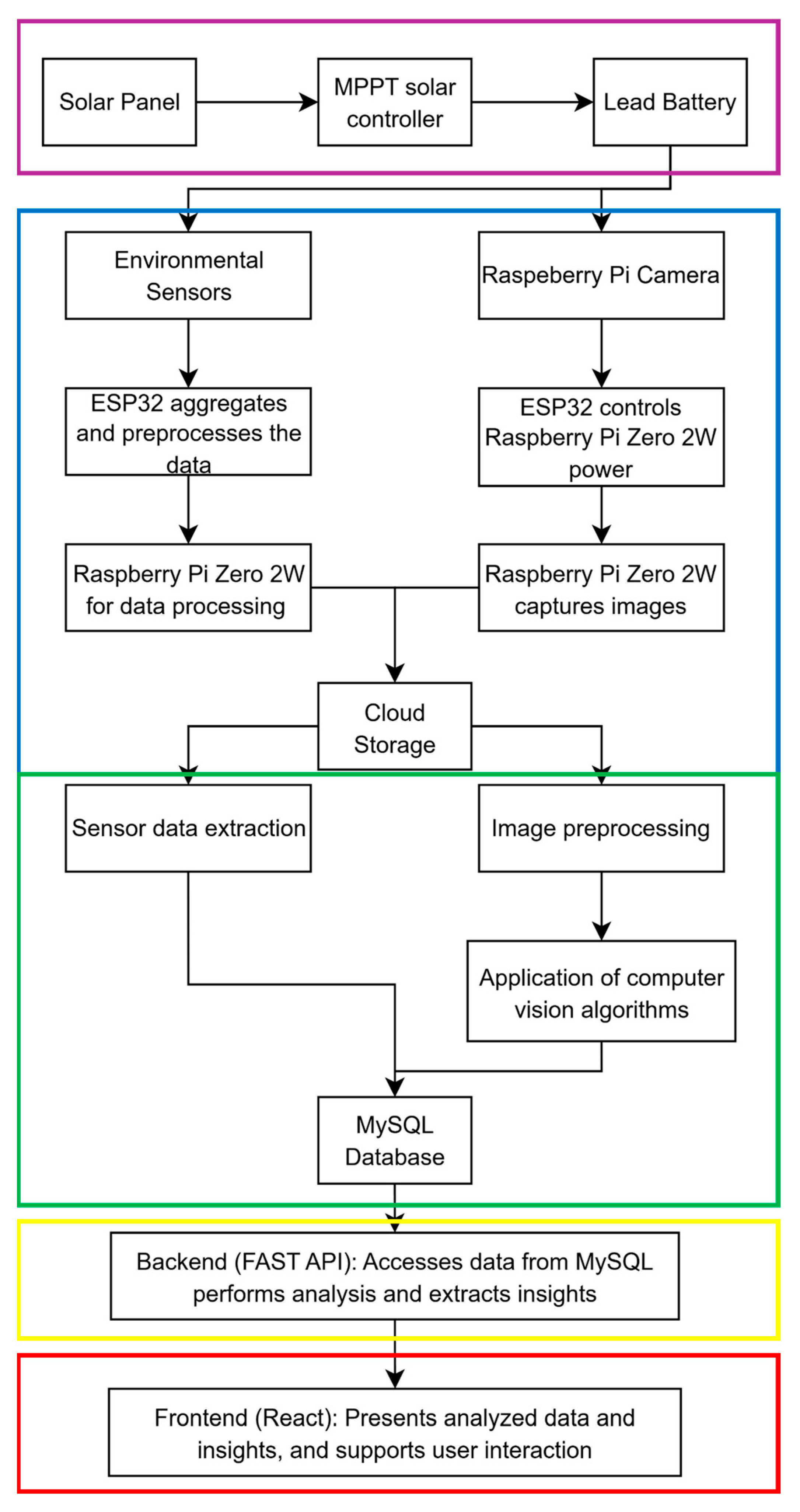 The main energy management strategy is the duty cycle of the Raspberry Pi. One low-power ESP32 runs continuously to collect sensor data, while the Raspberry Pi, the most power-intensive component, is kept off by default. Then the ESP32, responsible for the power management of the image branch, activates the Raspberry Pi’s only for the short duration required to capture and transmit images, after which it is powered down again. This strategy is the primary mechanism for achieving the system’s long-term energy autonomy.