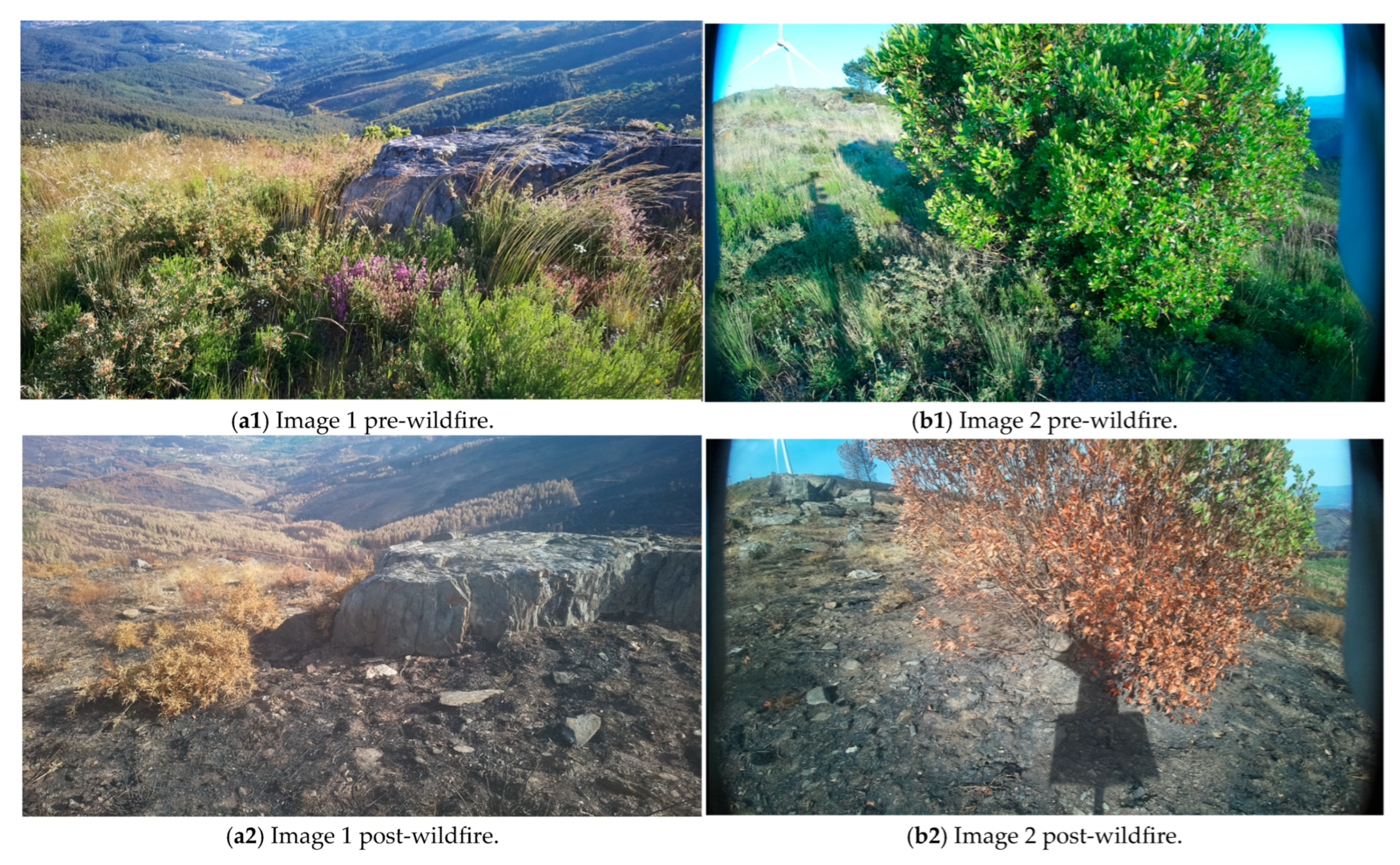 Figure 4 depicts the pre- and post-fire conditions at one of the LITecS station sites, providing visual evidence of the extensive ecological impact observed in the aftermath of the event.