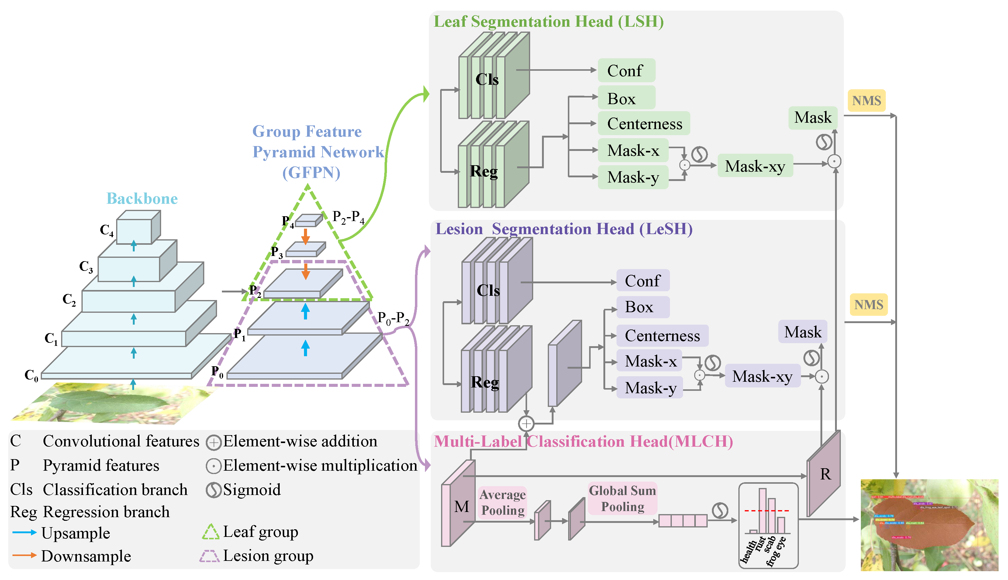 - We introduce a multi-task learning architecture that integrates GFPN for multi-scale feature extraction, MLCH for disease type prediction, and segmentation heads (LSH and LeSH) for precise leaf and lesion delineation, significantly enhancing disease identification accuracy and lesion localization.