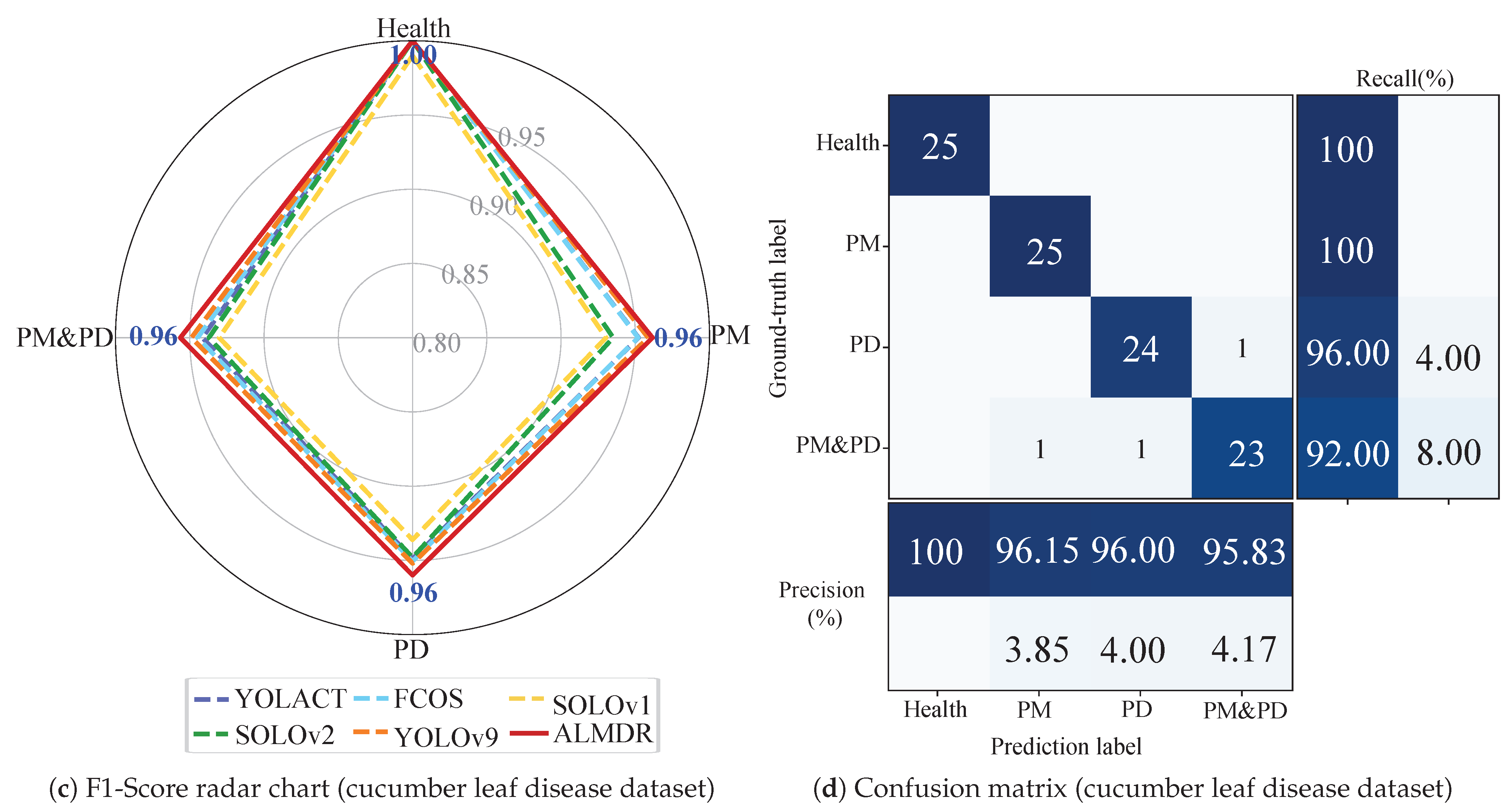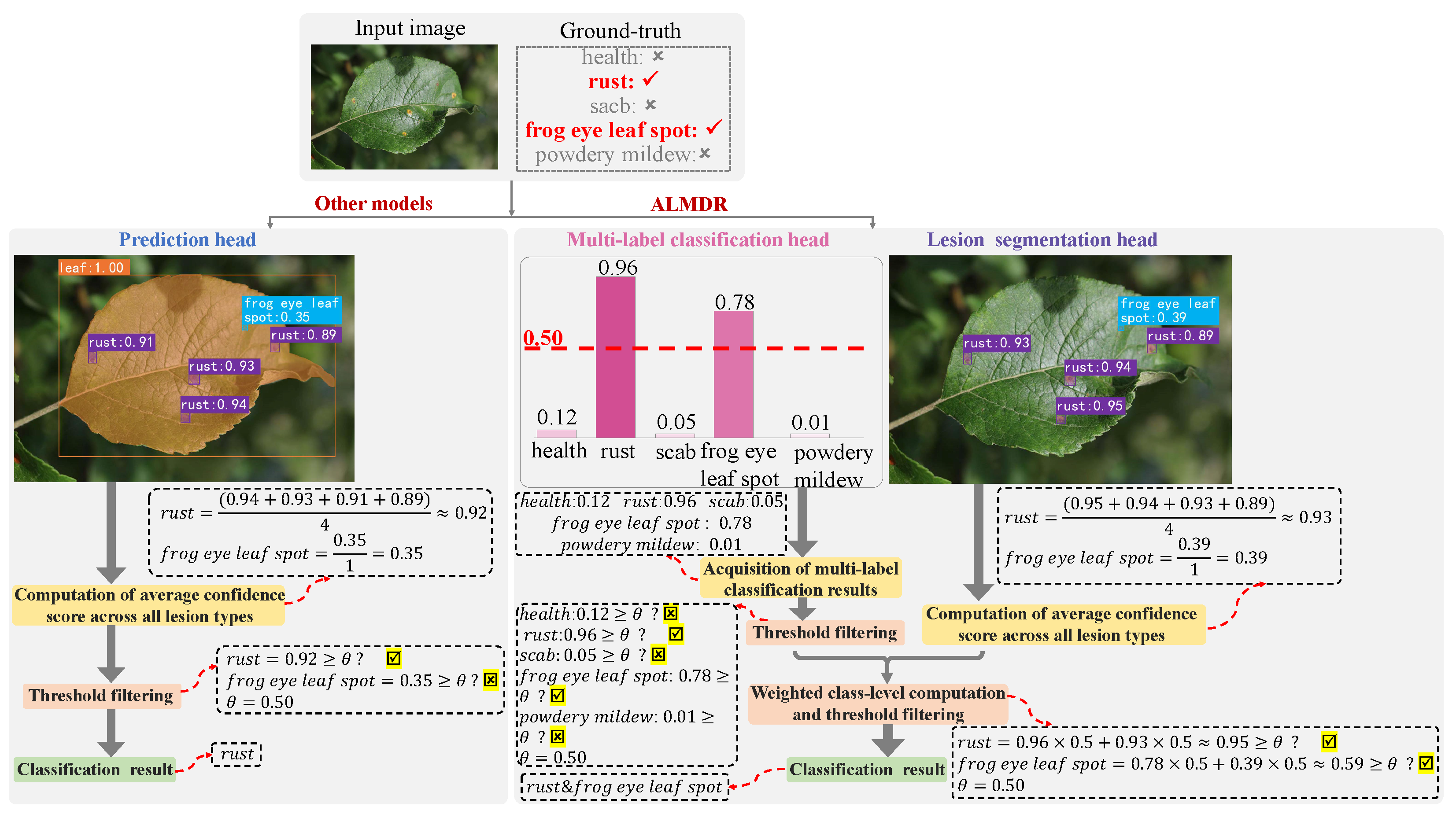 - Classification task metrics: Disease classification in instance segmentation models typically relies on aggregating confidence scores from detected instances. The ALMDR model enhances this approach by effectively integrating outputs from three key modules for disease classification: LSH for precise leaf area delineation, LeSH for instance-level disease predictions, and MLCH for image-level multi-disease detection. Figure 6 provides a detailed comparison of confidence score computation methods between ALMDR and other models.