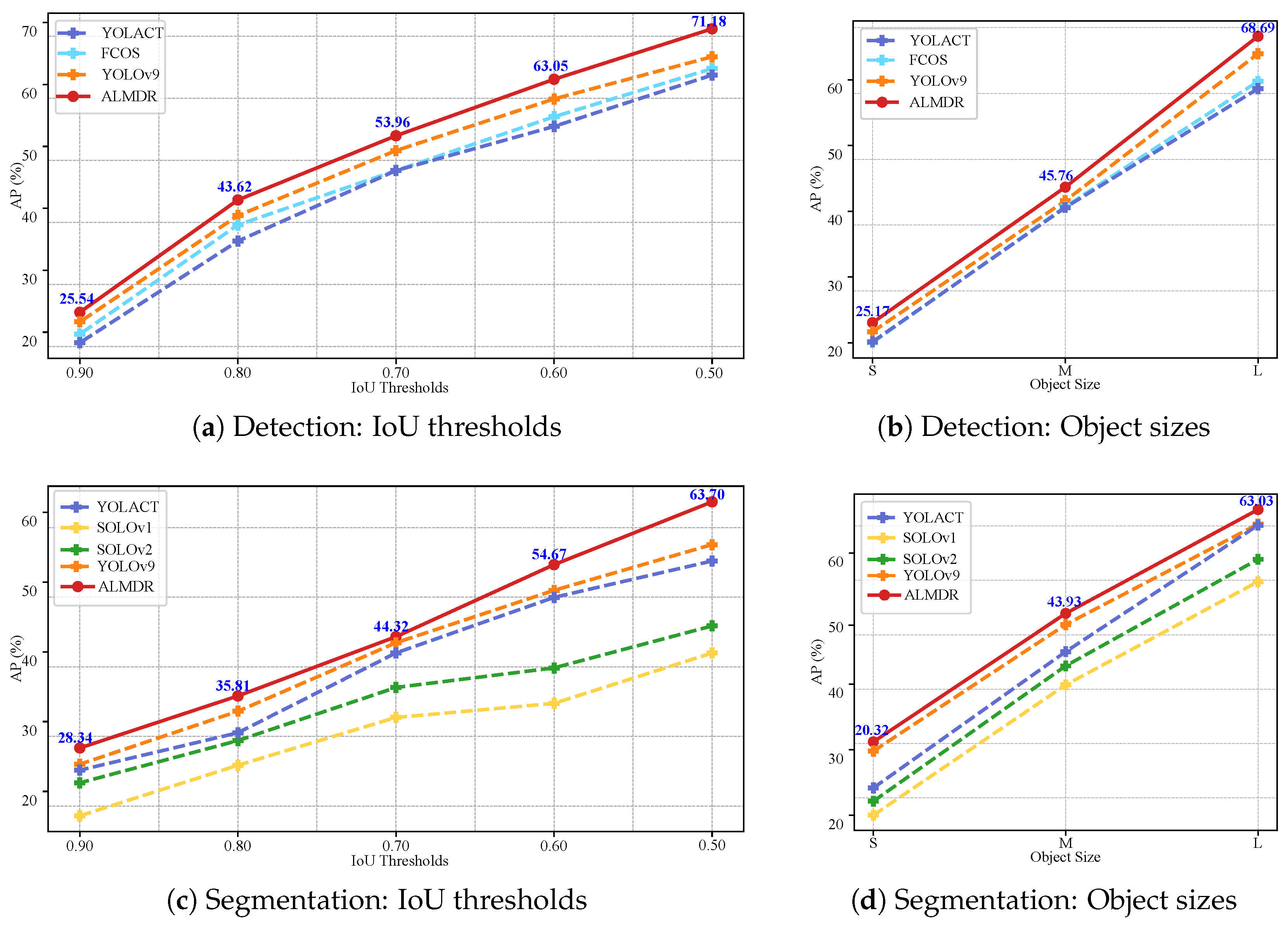 - Detection and segmentation task metrics: For detection and segmentation tasks, we adopt evaluation metrics consistent with the COCO dataset [65], including threshold-based and object size-based metrics. This facilitates comparisons with other research in the computer vision field. We assess the model’s performance using average precision (AP) at different intersection over union (IoU) thresholds, ranging from to with a step size of 0.10. For example, considers a prediction correct when the predicted bounding box has an with the ground truth and the predicted category matches. We also compute the mean average precision (mAP) and mean average recall (mAR) across these thresholds to reflect the model’s overall performance. Moreover, we use , , and to evaluate the model’s performance on small (area pixels), medium ( to pixels), and large (area pixels) objects, respectively. These metrics help assess the model’s ability to detect and segment objects across different scales.