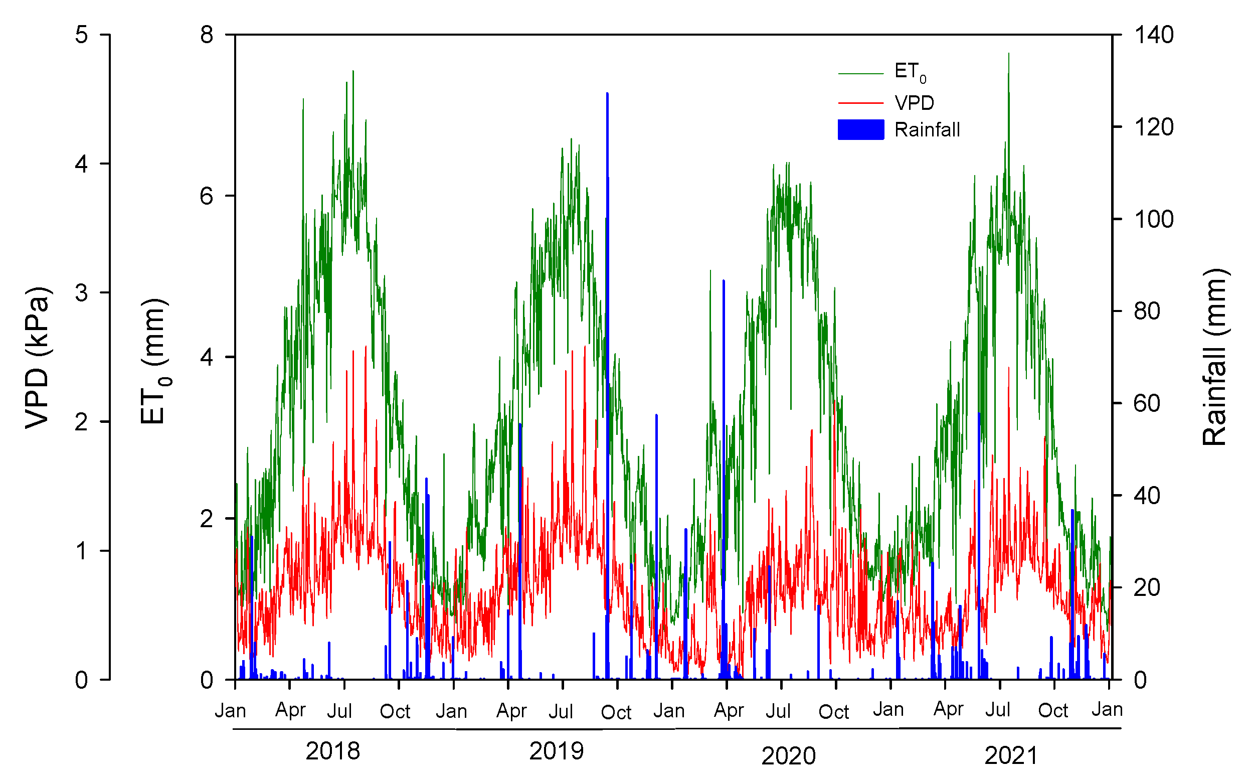 3.1. Climatic Conditions and Irrigation Water Applied During the Experimental Period