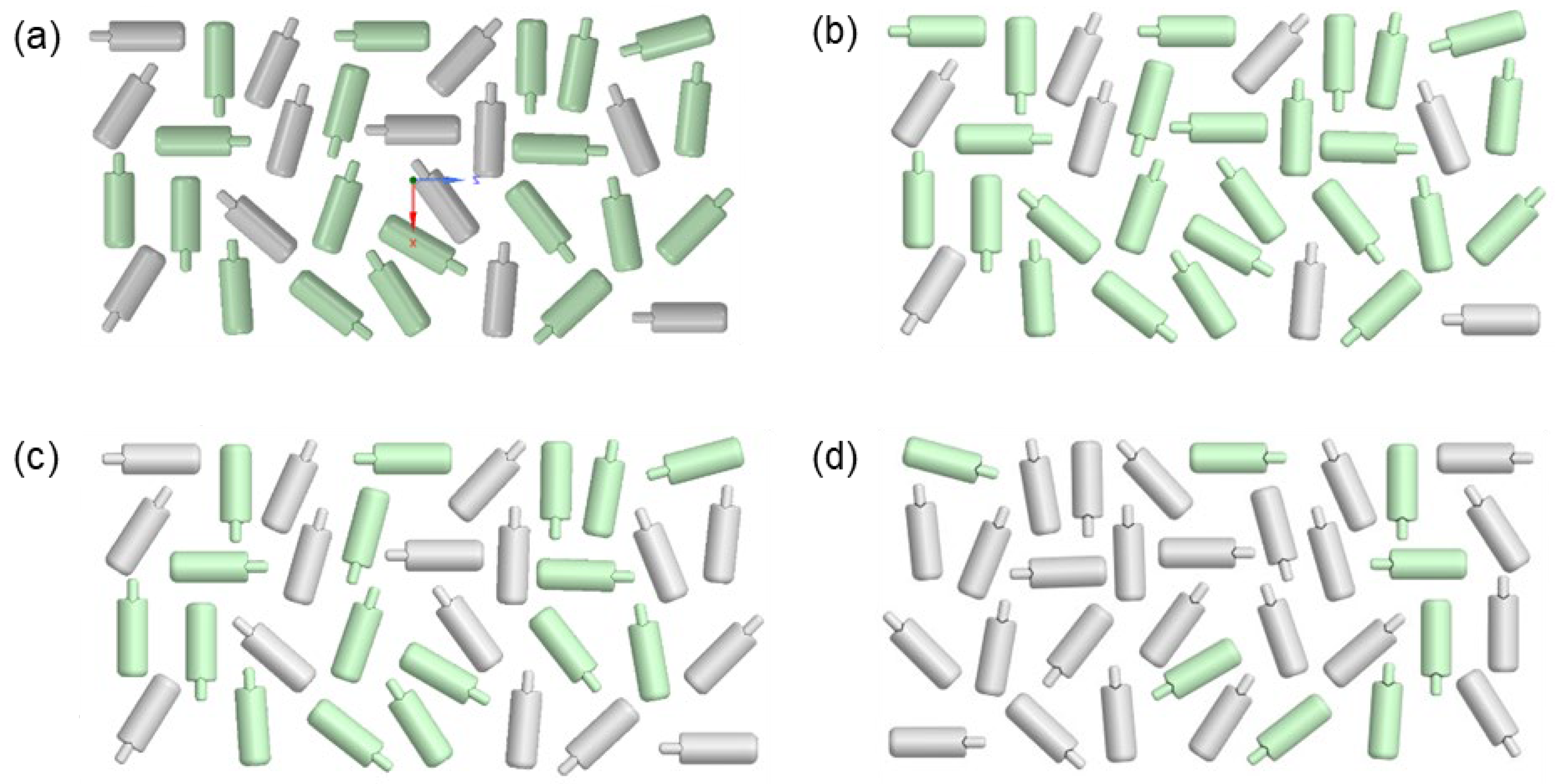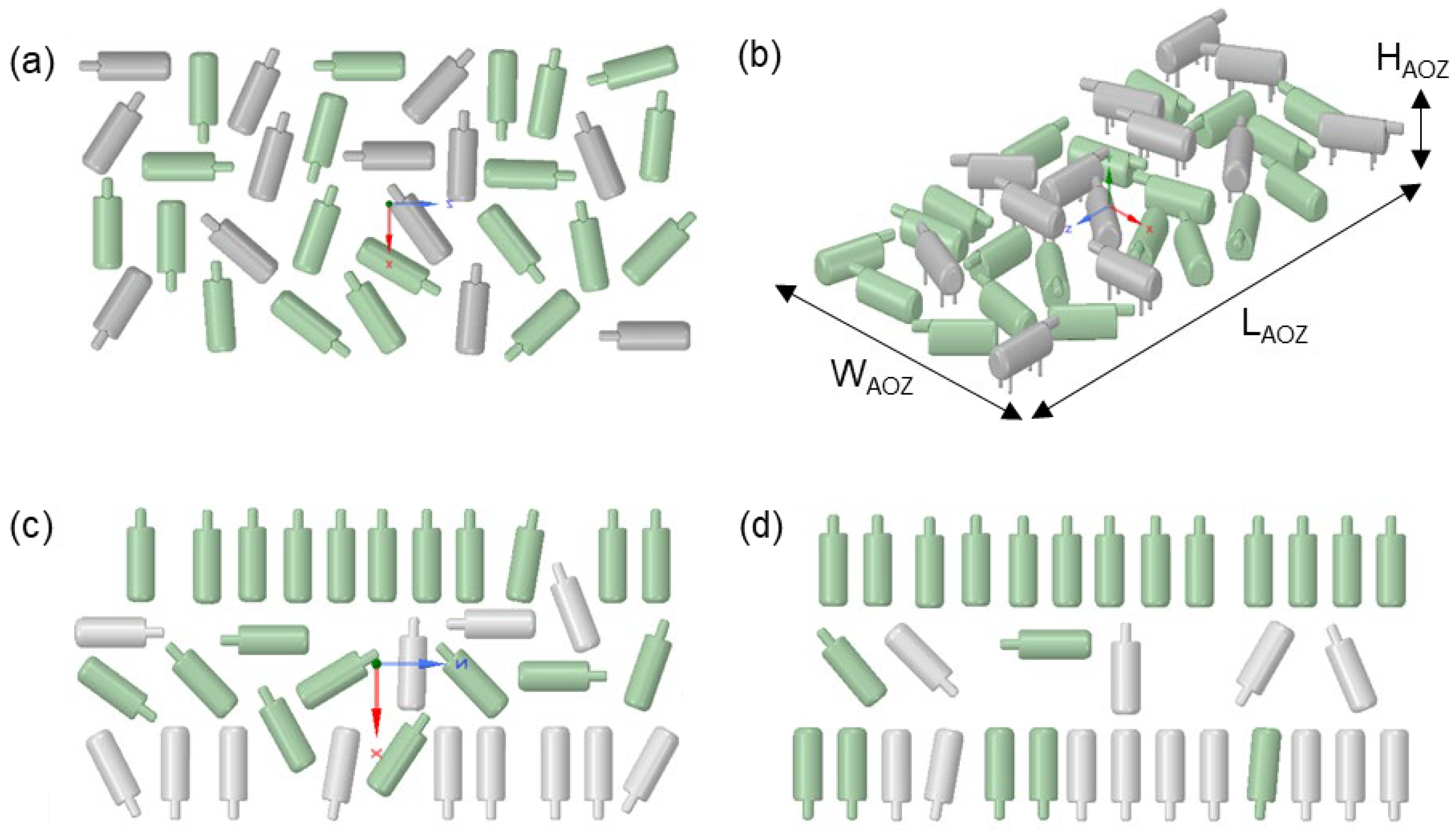 Lying and standing cows were distributed randomly within the AOZ. While in the original study only three angle positions of cows were implemented (15°, 30°, and 90°), in the present study, different sets of angle positions were permitted (any angle randomly chosen between 0° and 90°). In addition, in the original study [