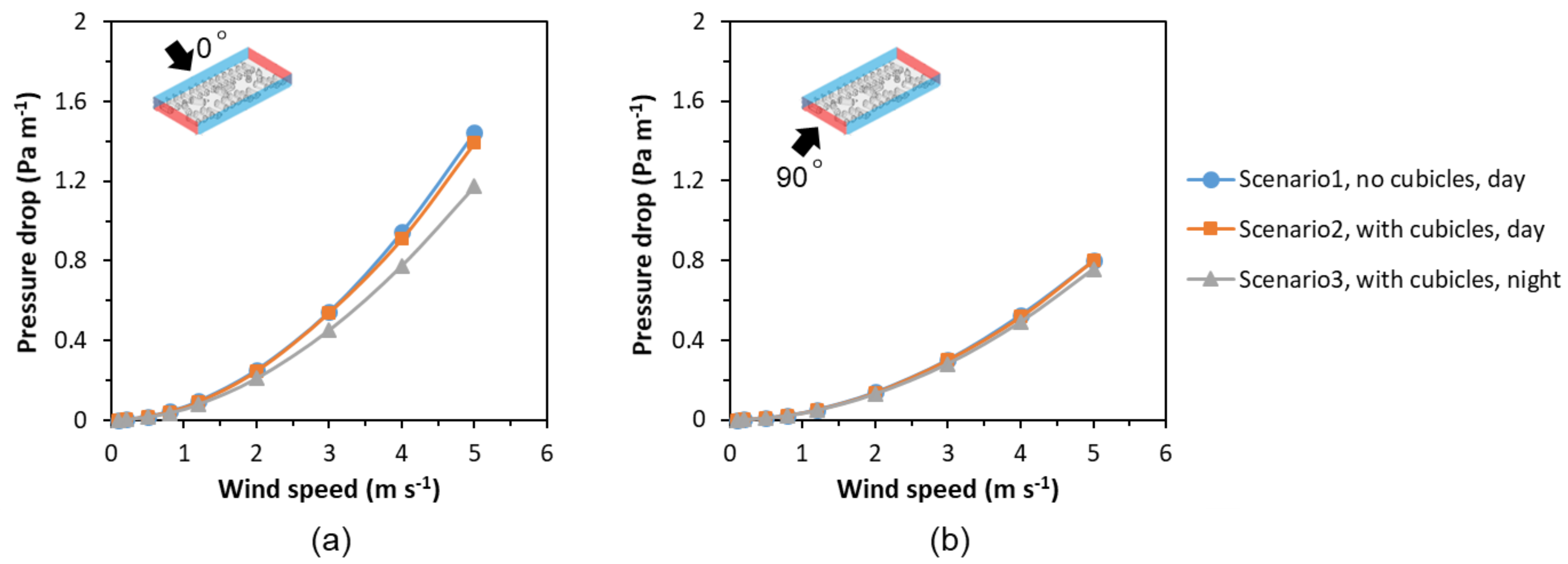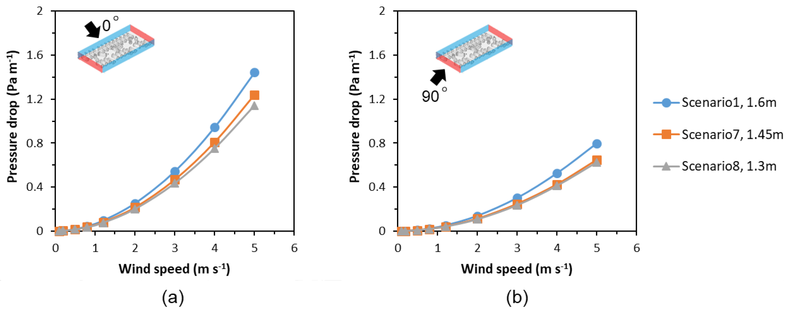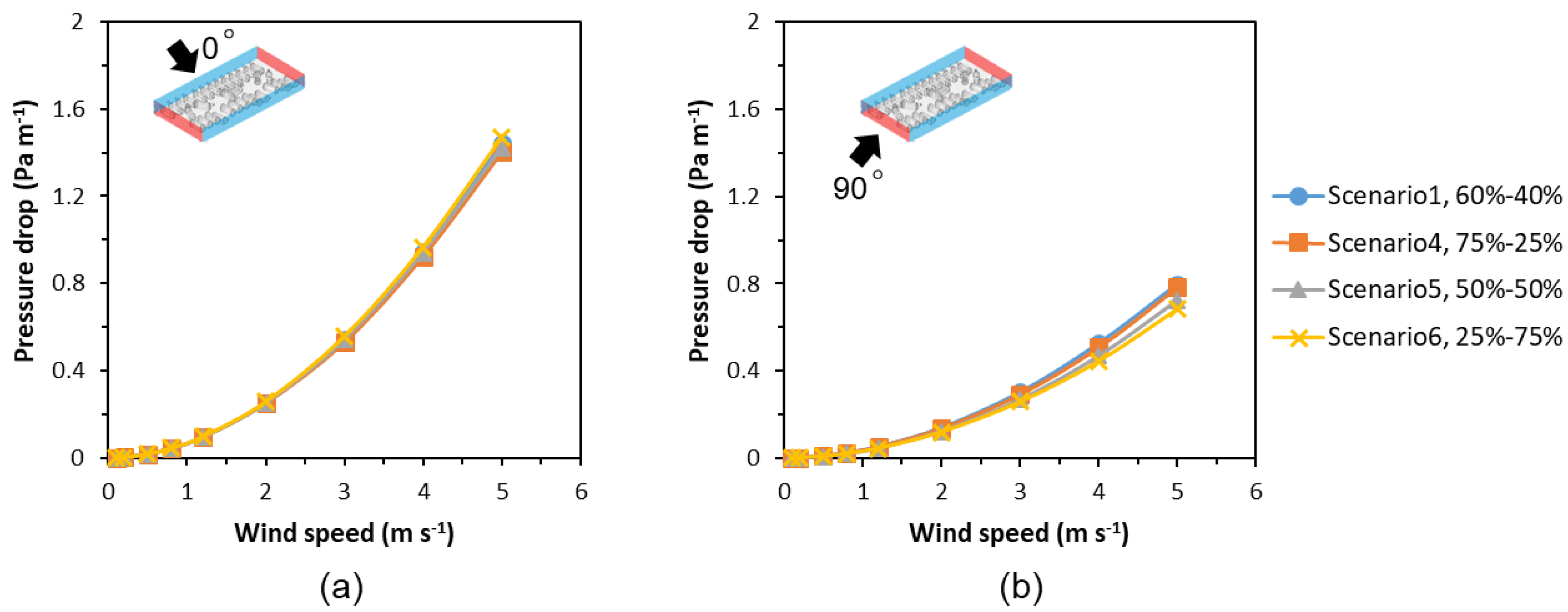 The pressure drop increased with the increasing wind speed for all scenarios. At 0° wind direction, higher pressure drop values were obtained than at 90° wind direction, reflected by higher viscous and inertial resistance. The cow position, in general, had little impact on the pressure drop at low wind speeds, while showing differences among different scenarios when the wind speed was over 2 m s−1, with the highest difference of 0.269 Pa m−1 between Scenario 1 and Scenario 3 at 5 m s−1 wind speed and 0° wind direction.