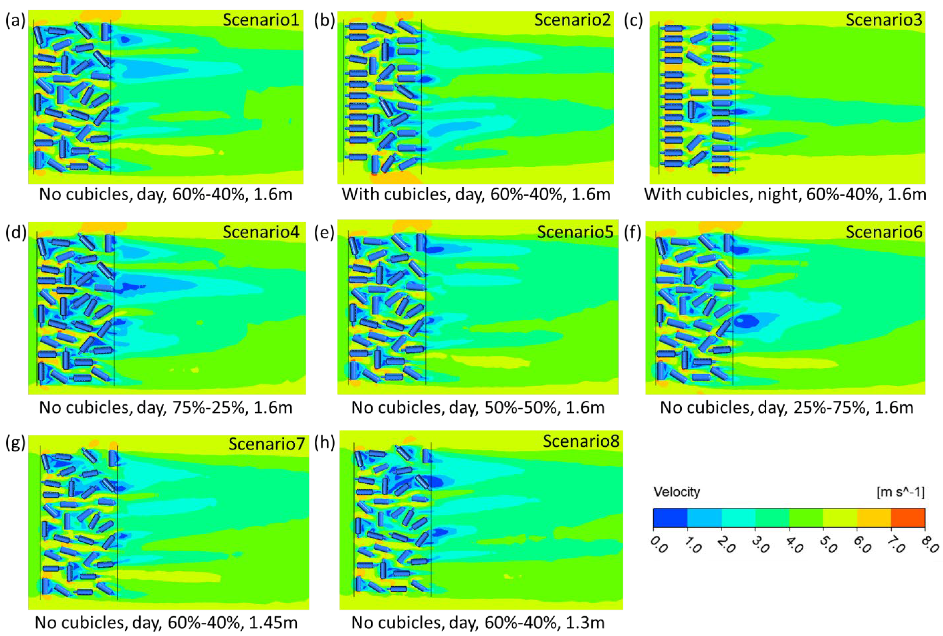 20]. No cubicles, AOZ height of 1.6 m, and two wind directions were also considered in the baseline case.