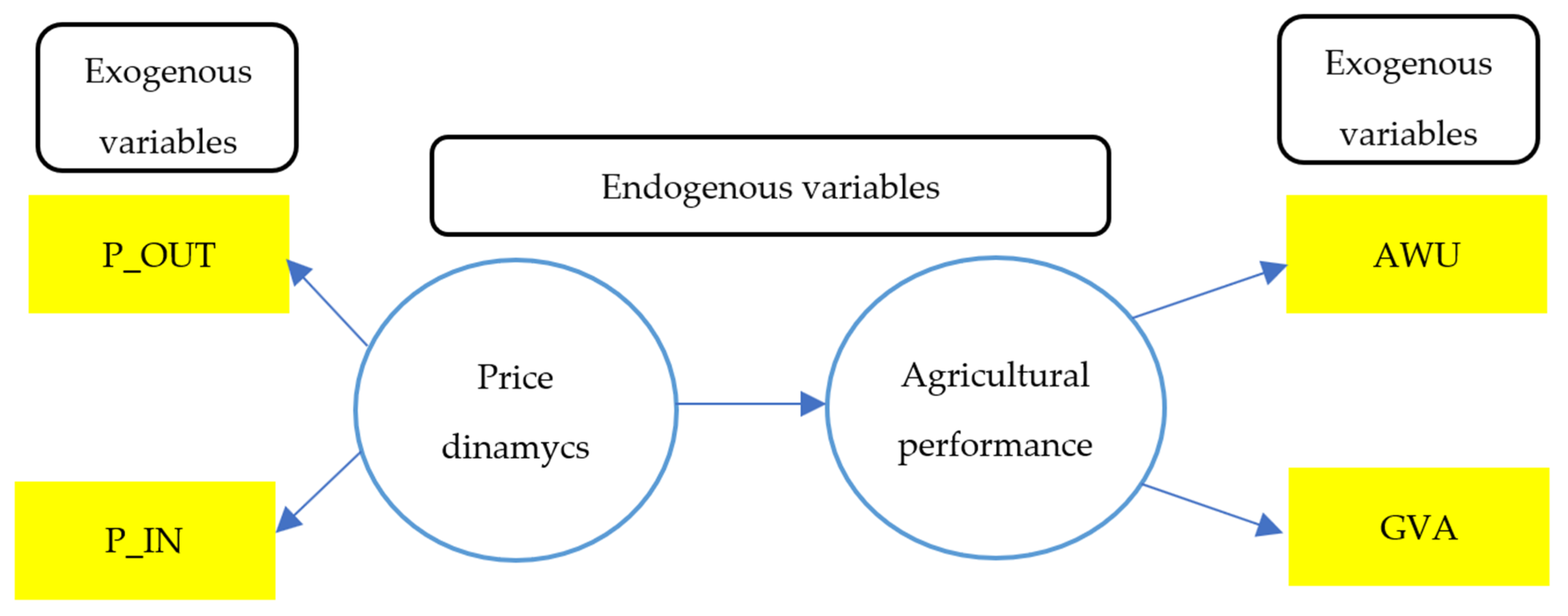 The conceptual model explicitly distinguishes between exogenous and endogenous constructs. The model treats agricultural price dynamics as an exogenous driver and sectoral performance indicators as endogenous outcomes. In line with the study’s objective of emphasizing direct associations and cross-country asymmetries, no mediating or moderating variables are included (
